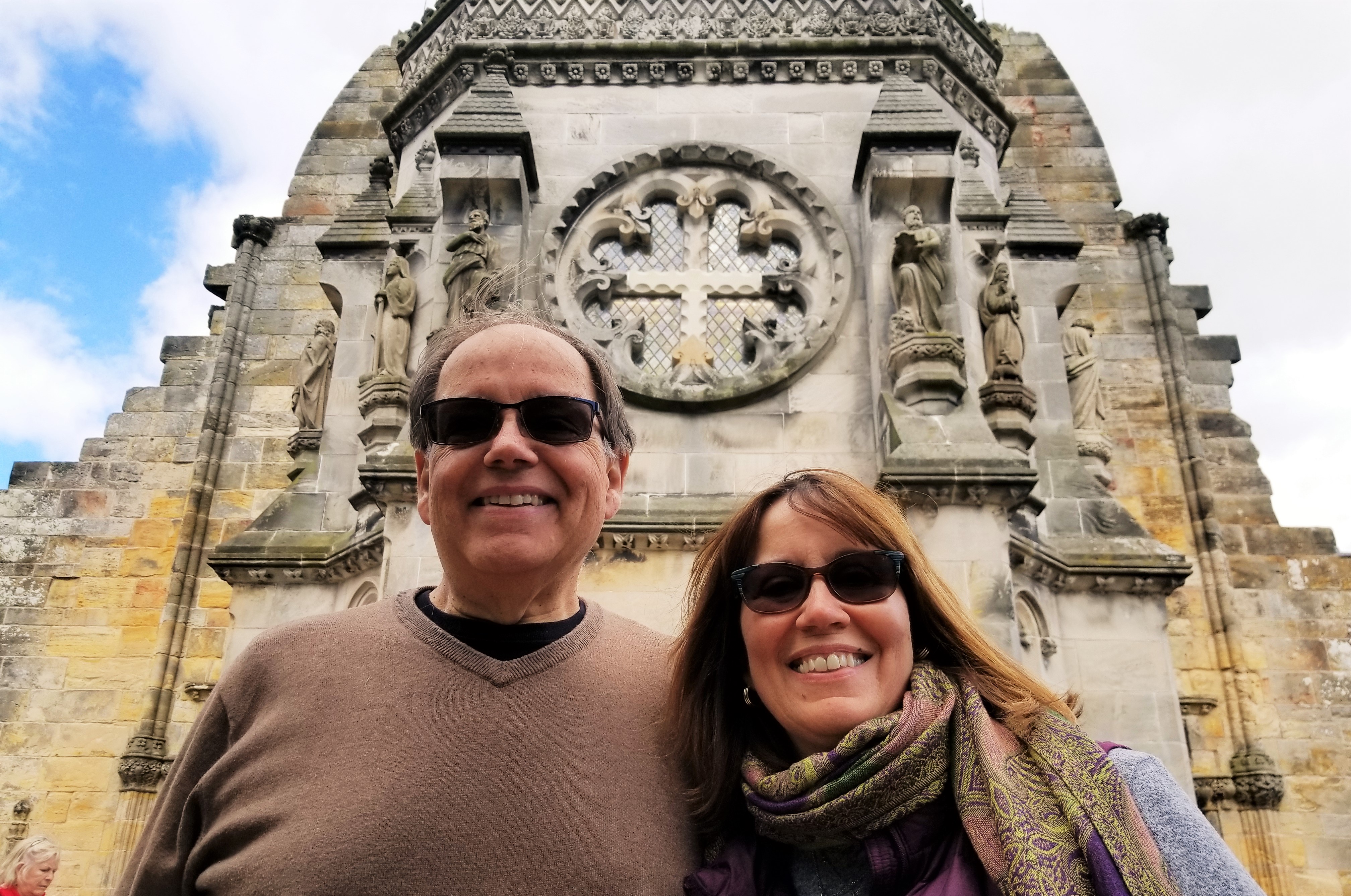 We spent ten days in Edinburgh near the landmark area of the”Meadows”. This picture was taken at Rosslyn Chapel — the same Rosslyn Chapel featured in Dan Brown’s novel Da Vinci Code. Jon loved checking out details mentioned in the book, especially going down into the crypt, and seeing a tomb of a Knight Templar.
