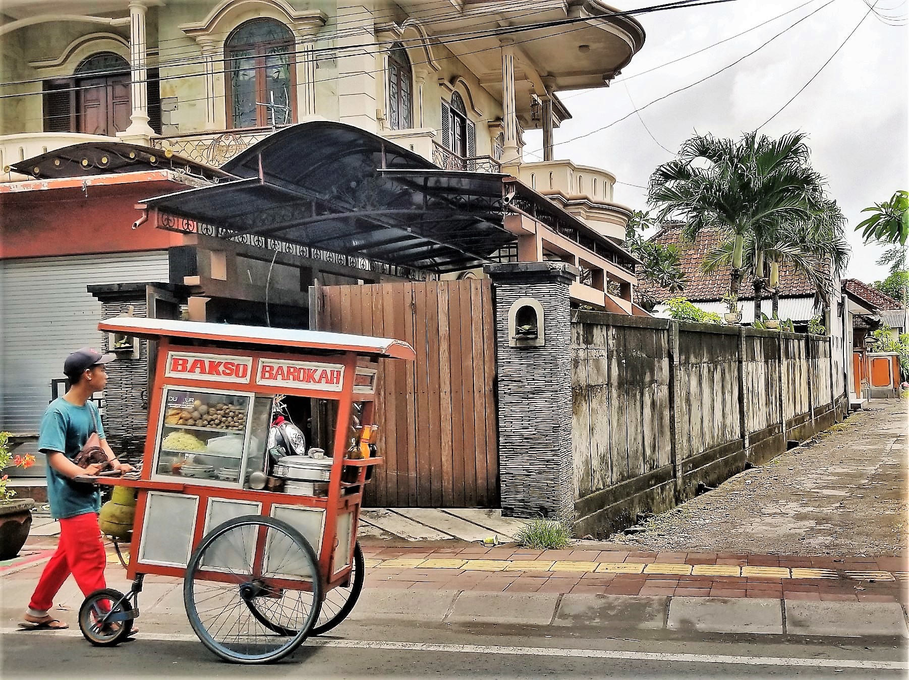 It is common to see hand pushed food carts next to restaurants with modern art and sculpture displays. This highlights the evolving culture with the old competing with the new.