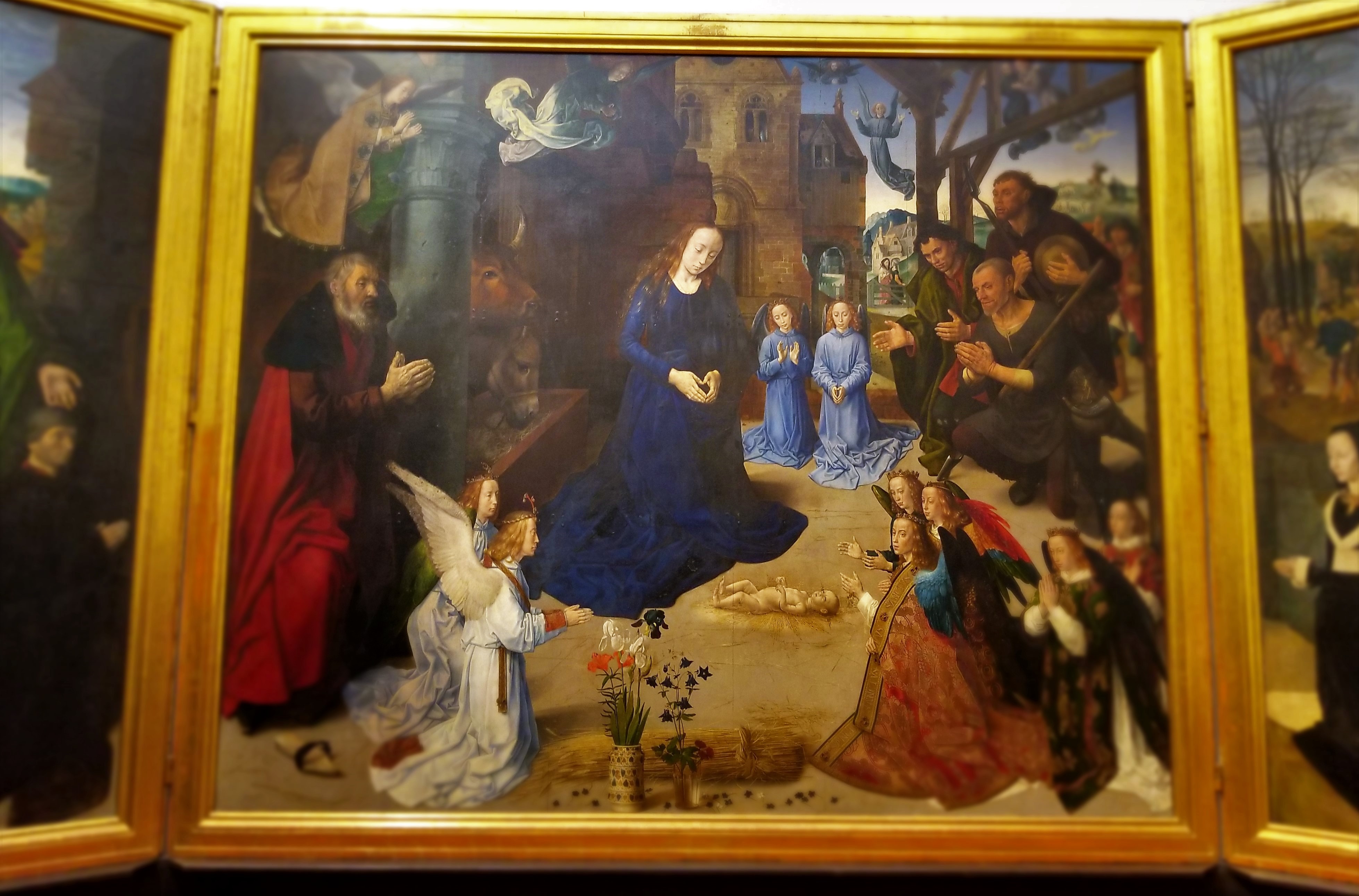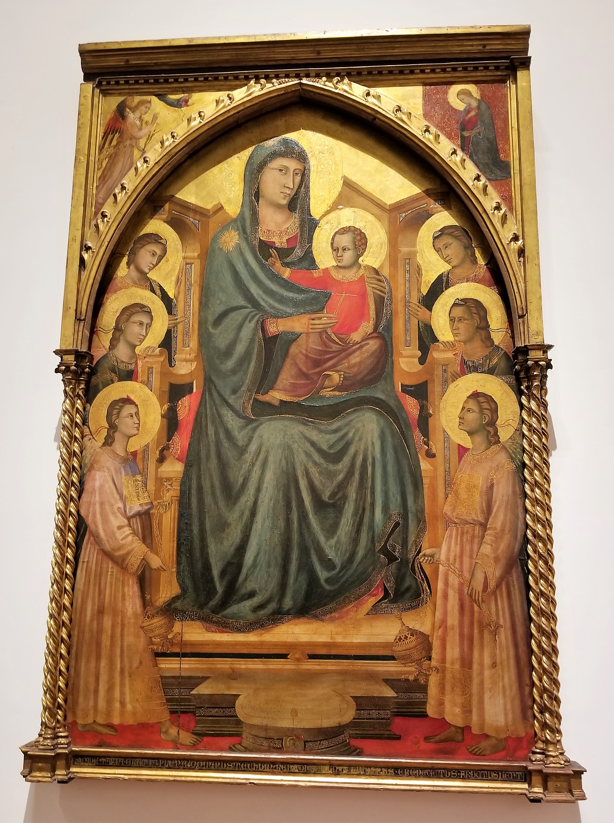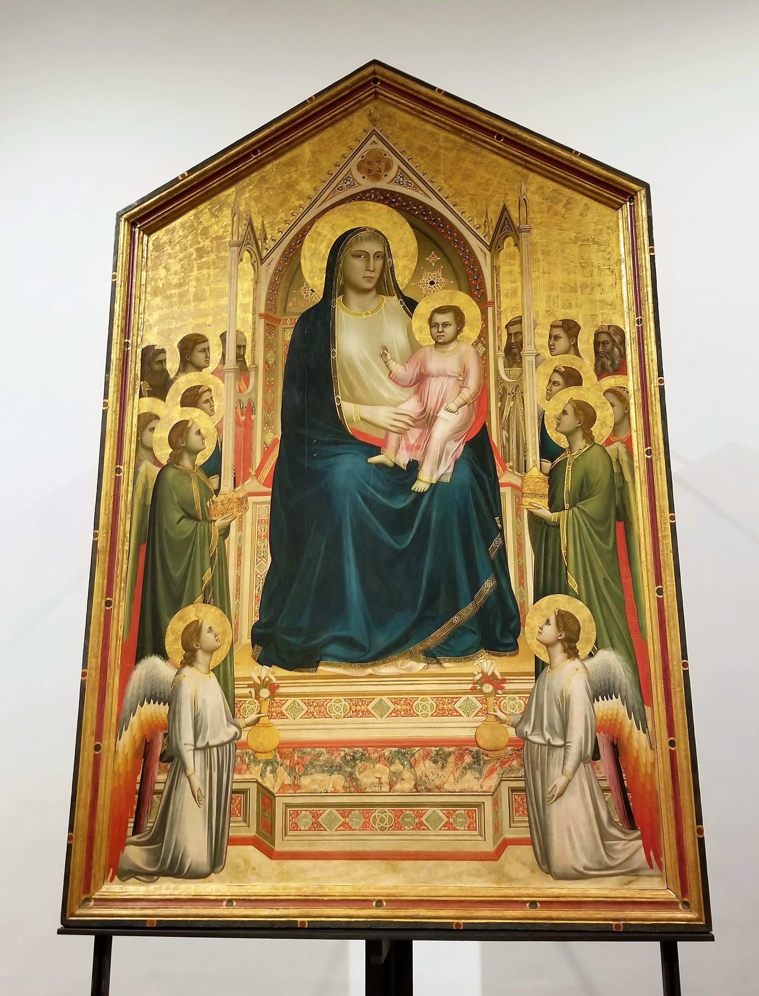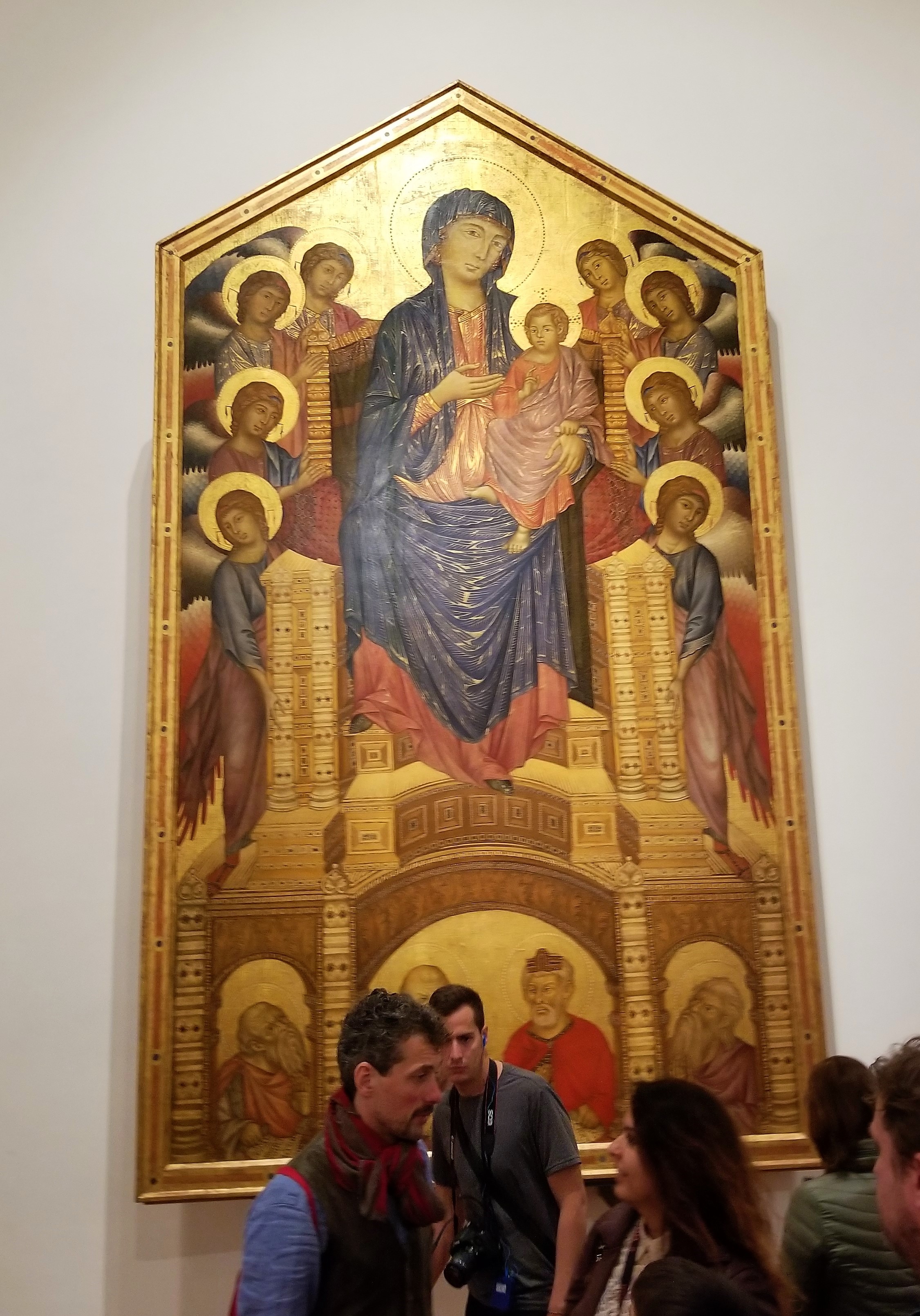 Entering our first gallery, Caterina explained and contrasted similar paintings of the Madonna from different periods. She explained how the earlier painting lacked depth and was more two-dimensional. Then Caterina pointed out the improvements made in a later painting where techniques for creating depth and perspective were employed. You’ll notice in the first example, the infant looks as if it could slide off the portrait because the Madonna’s knees don’t form a lap to support its body.