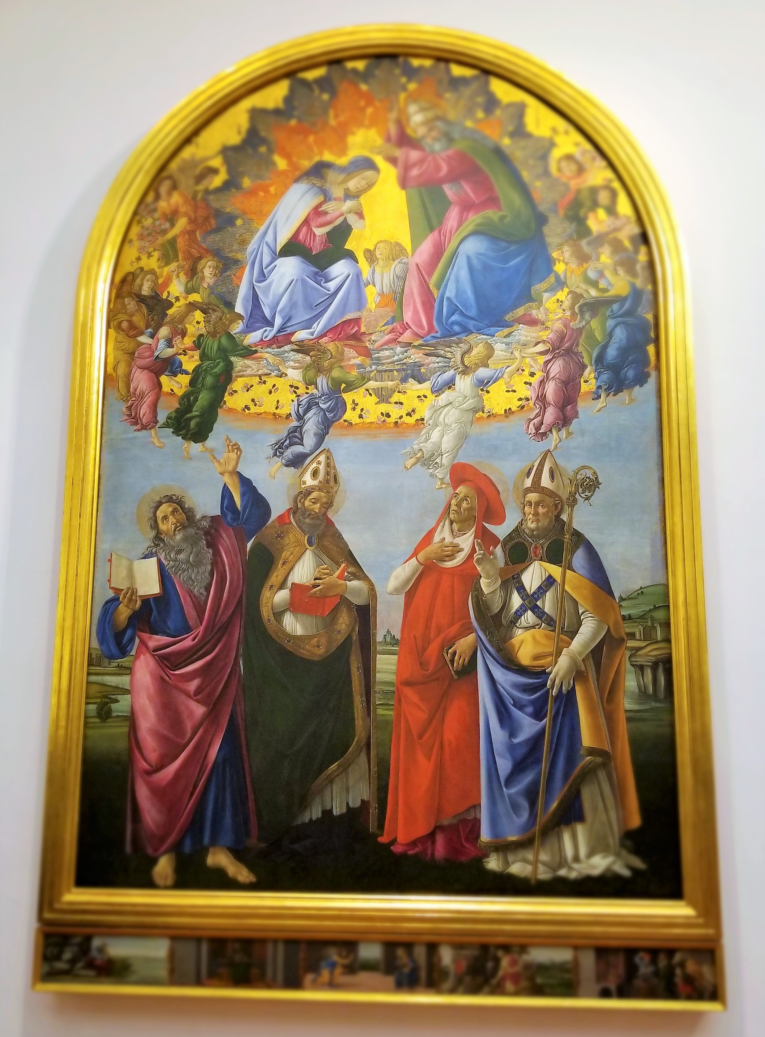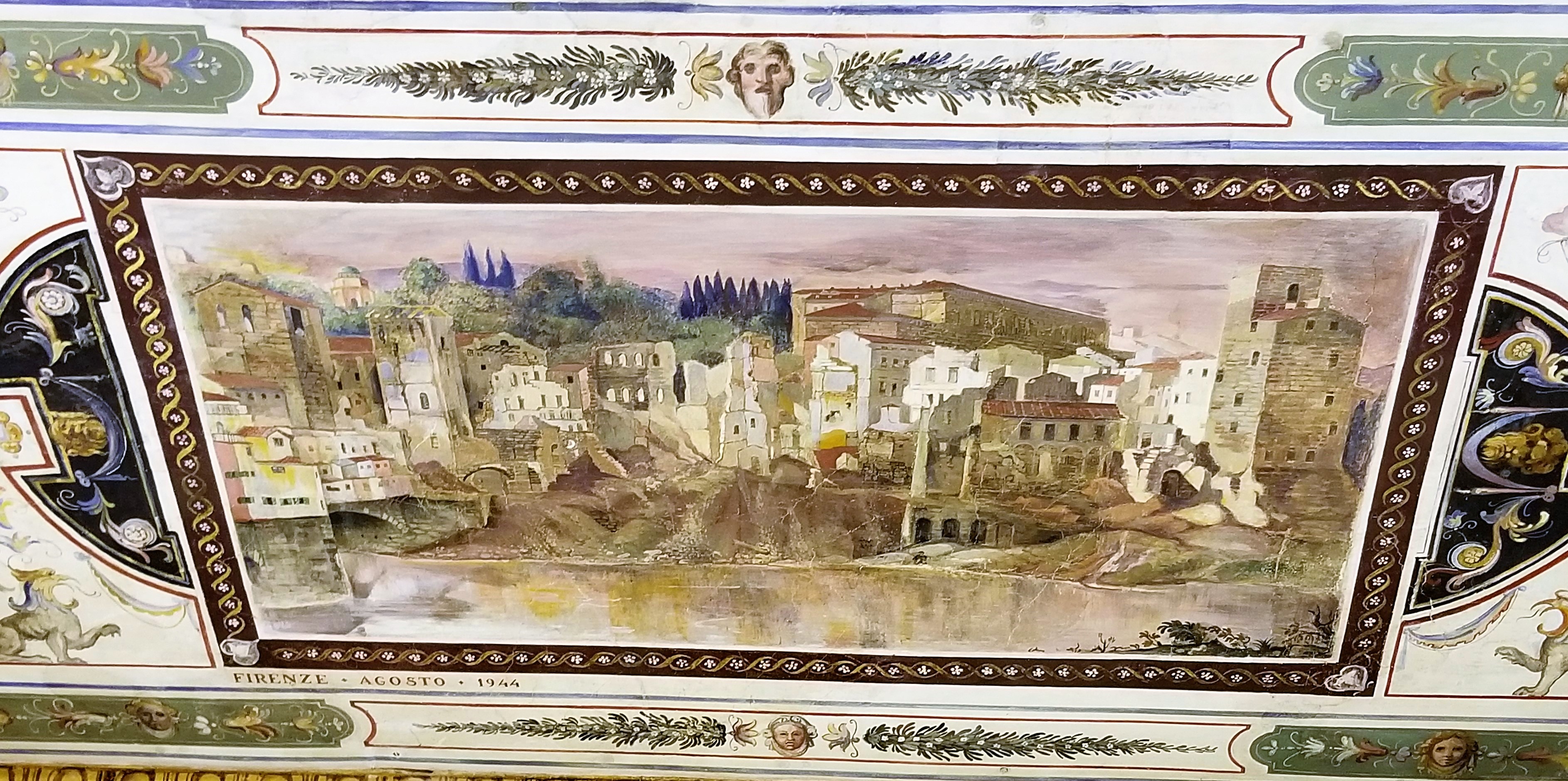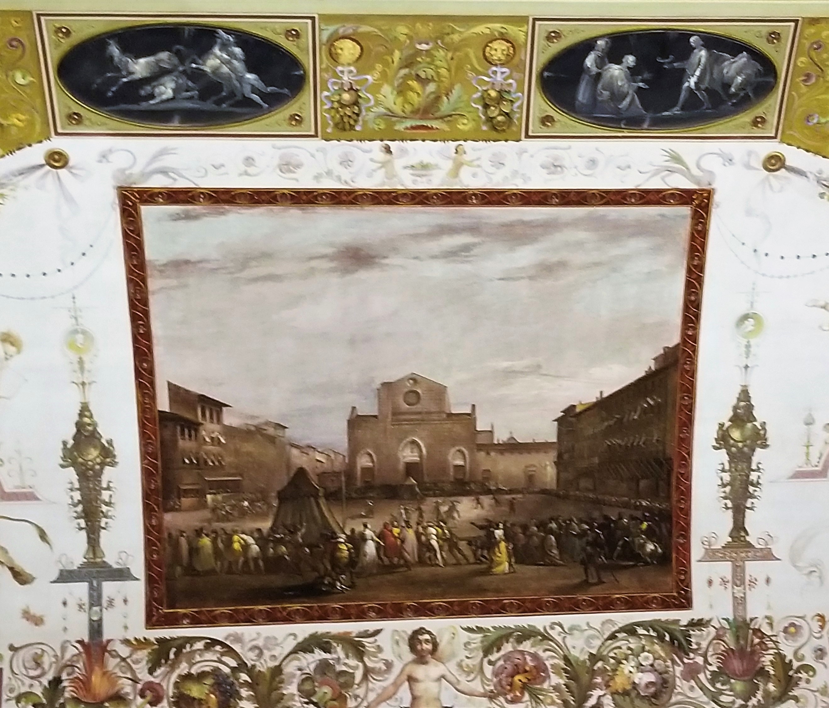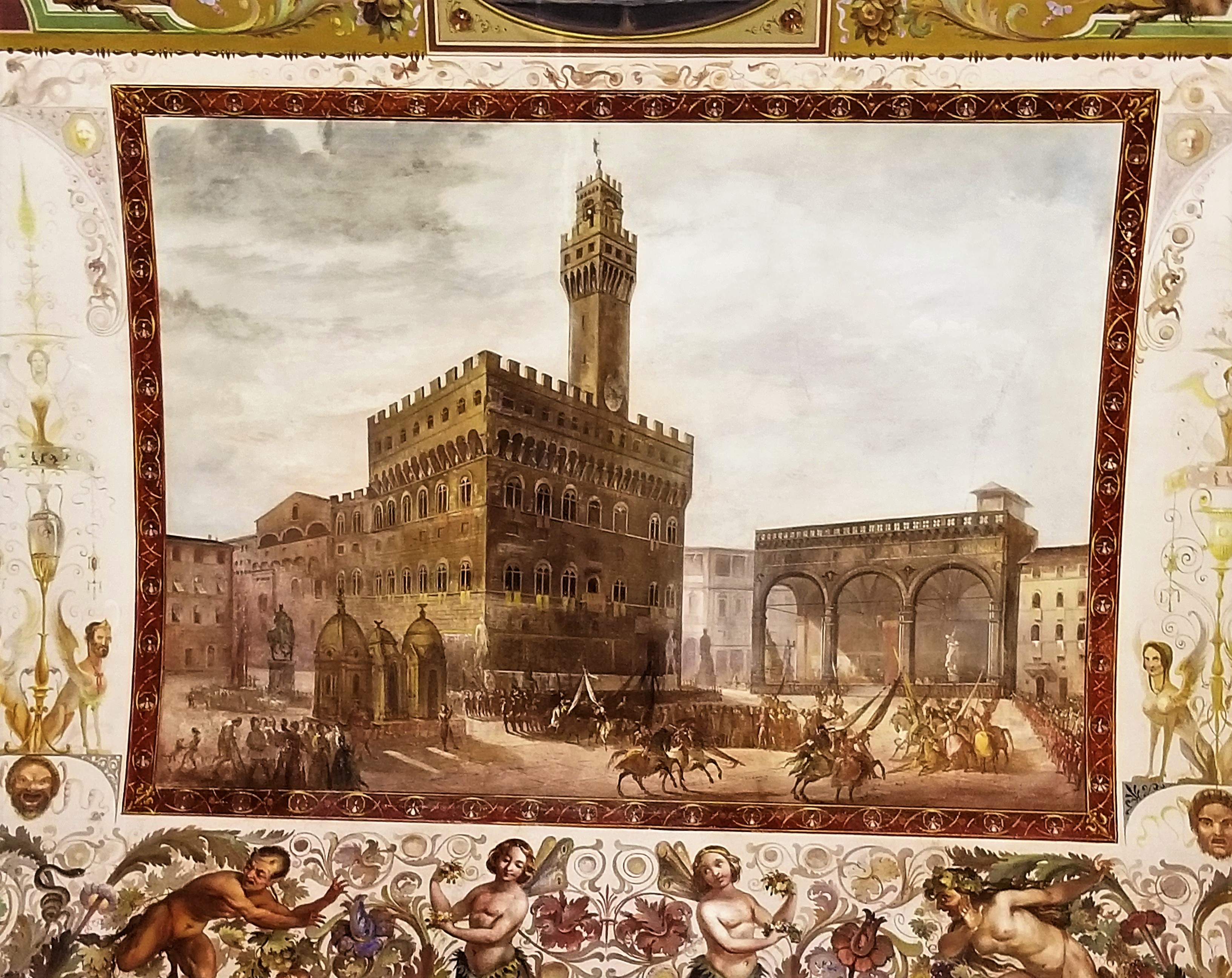 We were awed by the expanse and beauty of the frescoes. Lining the upper walls were large portraits of the Medici Family, and hundreds of small portraits of significant figures of the period, including popes, political figures and aristocrats. Caterina explained Cosimo di Giovanni de’ Medici dispatched his personal artist to make copies of significant portraits. Most of the original portraits were destroyed by floods or fires and would be lost. So arguably, the collection of copies in the Uffizi really are the originals today.