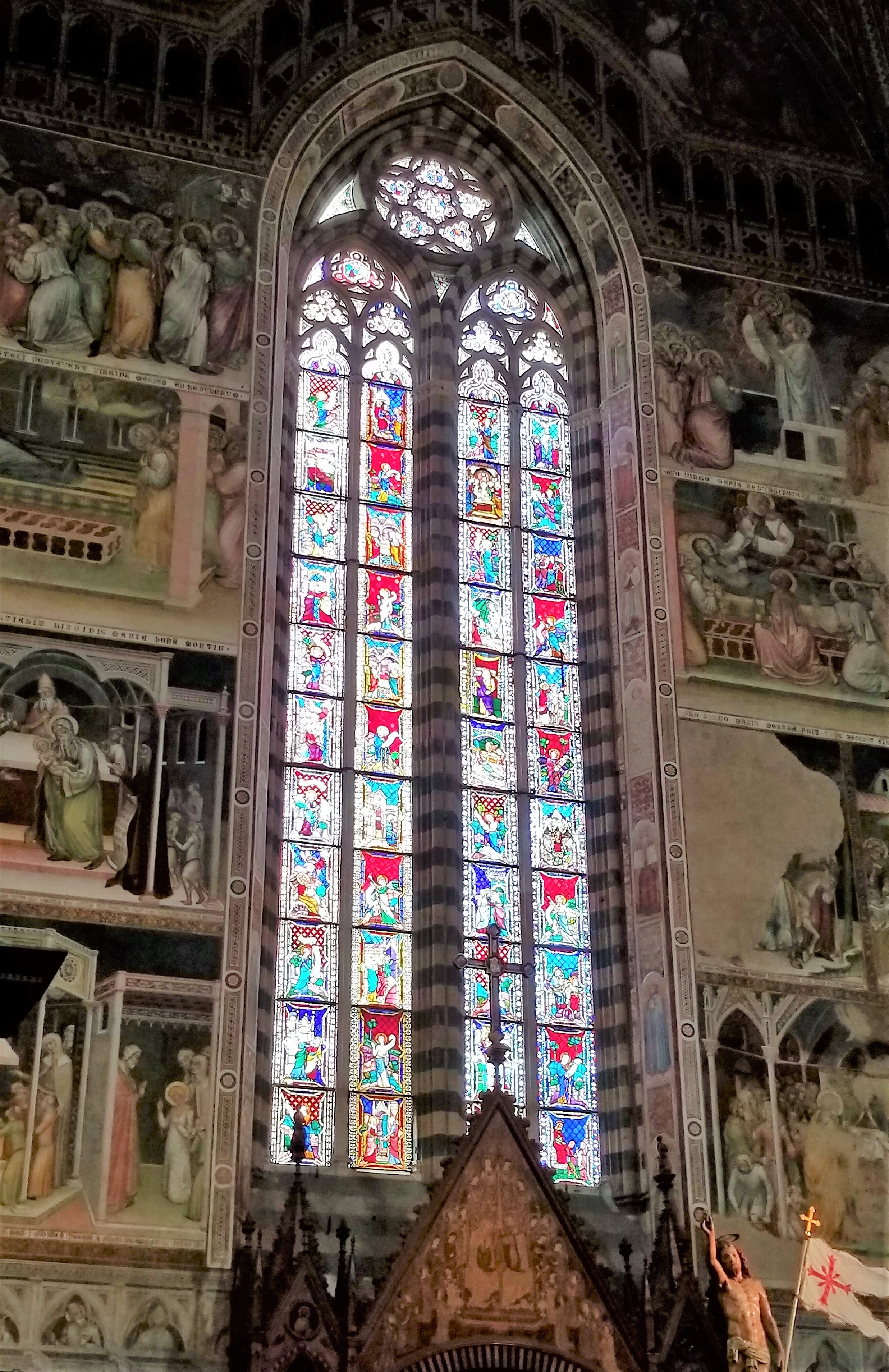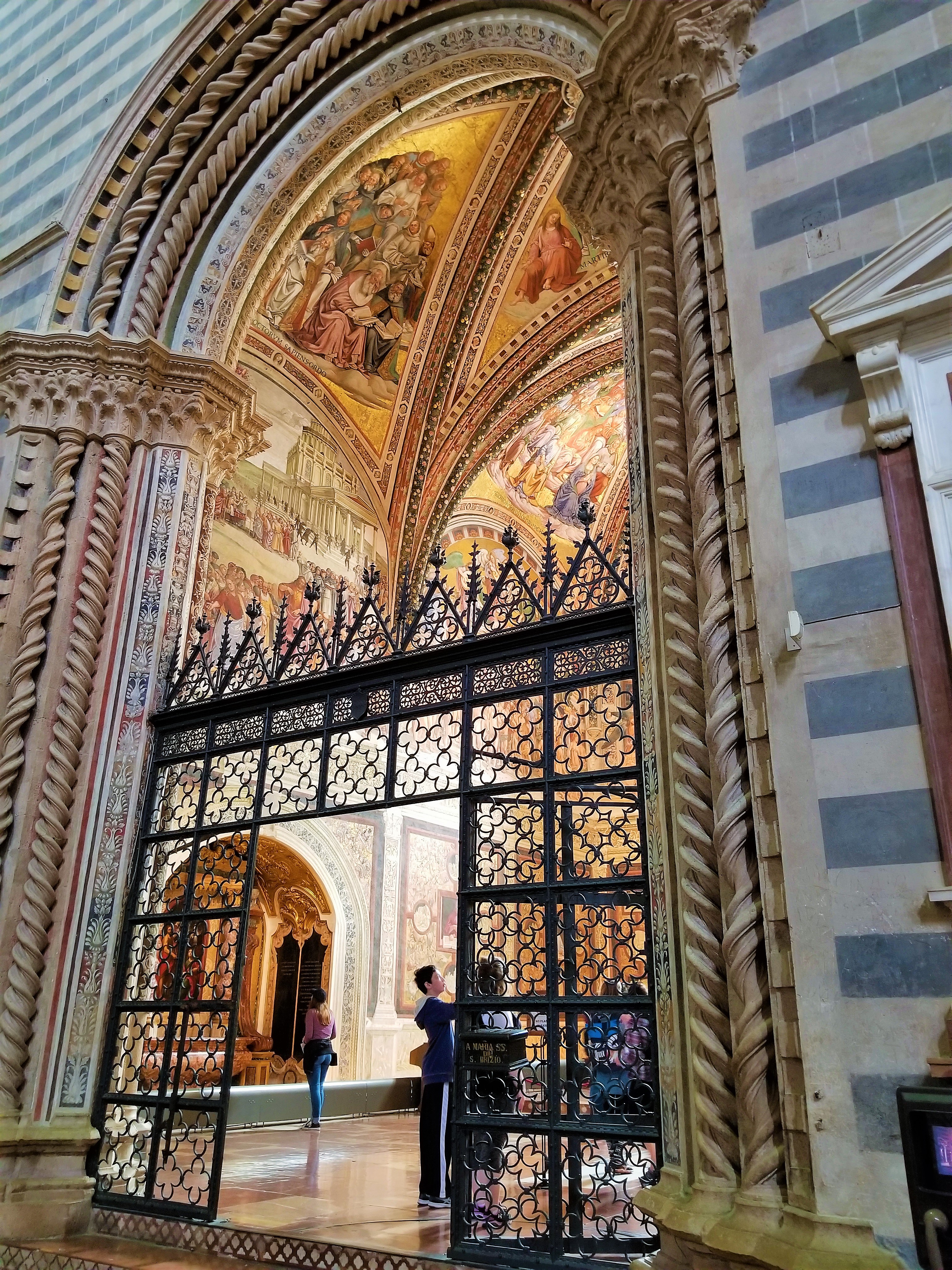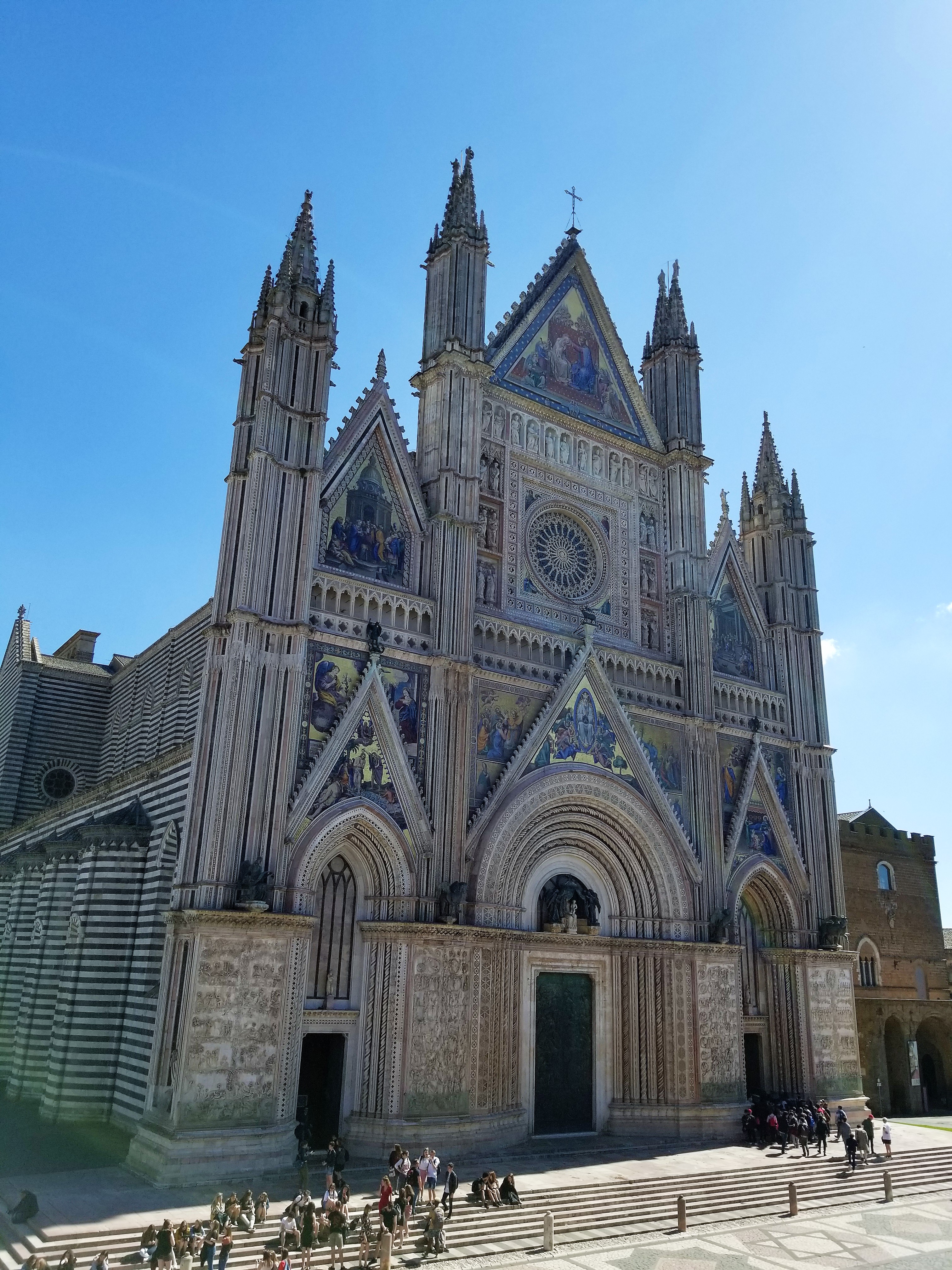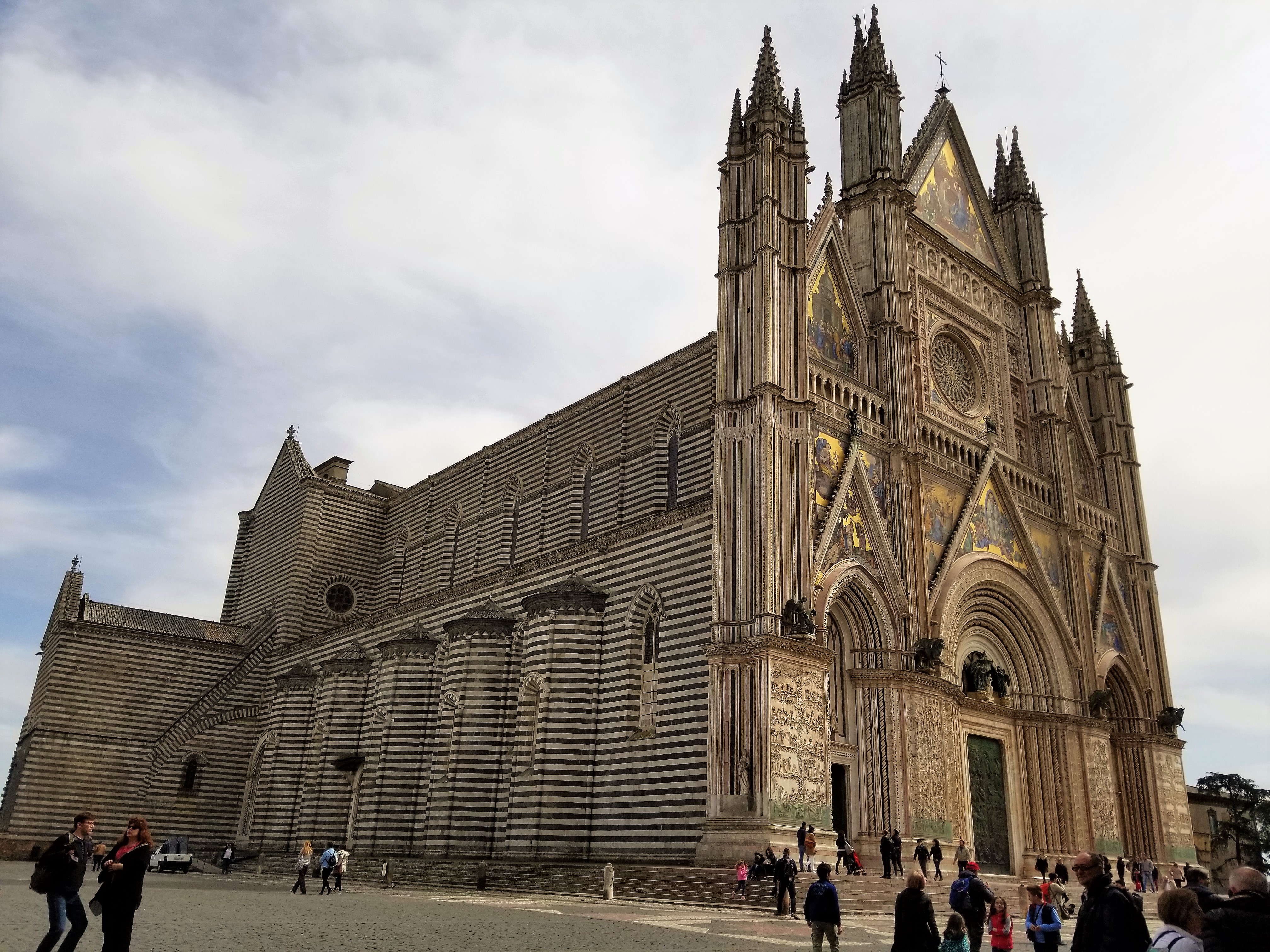 This massively imposing black and white striped cathedral is the real star of Orvieto and considered to be a glorious example of Italian Gothic architecture.  You come to  tour the inside with its ornate frescos, enormous doors and intricate reliefs, carvings and sculptures.  However, there is so much detail on the exterior that you can actually spend hours outside sitting on one of the benches  admiring the rich, opulent adornment of the façade. It is a true work of enduring art.  It took centuries to build which we find that hard  to conceive.  We can’t imagine the project management necessary to keep a massive project on course over many generations!  Wouldn’t changing architectural trends, community needs, and financial priorities have derailed the project from time-to-time?  In any event, the cathedral is breathtaking and enduringly beautiful.
