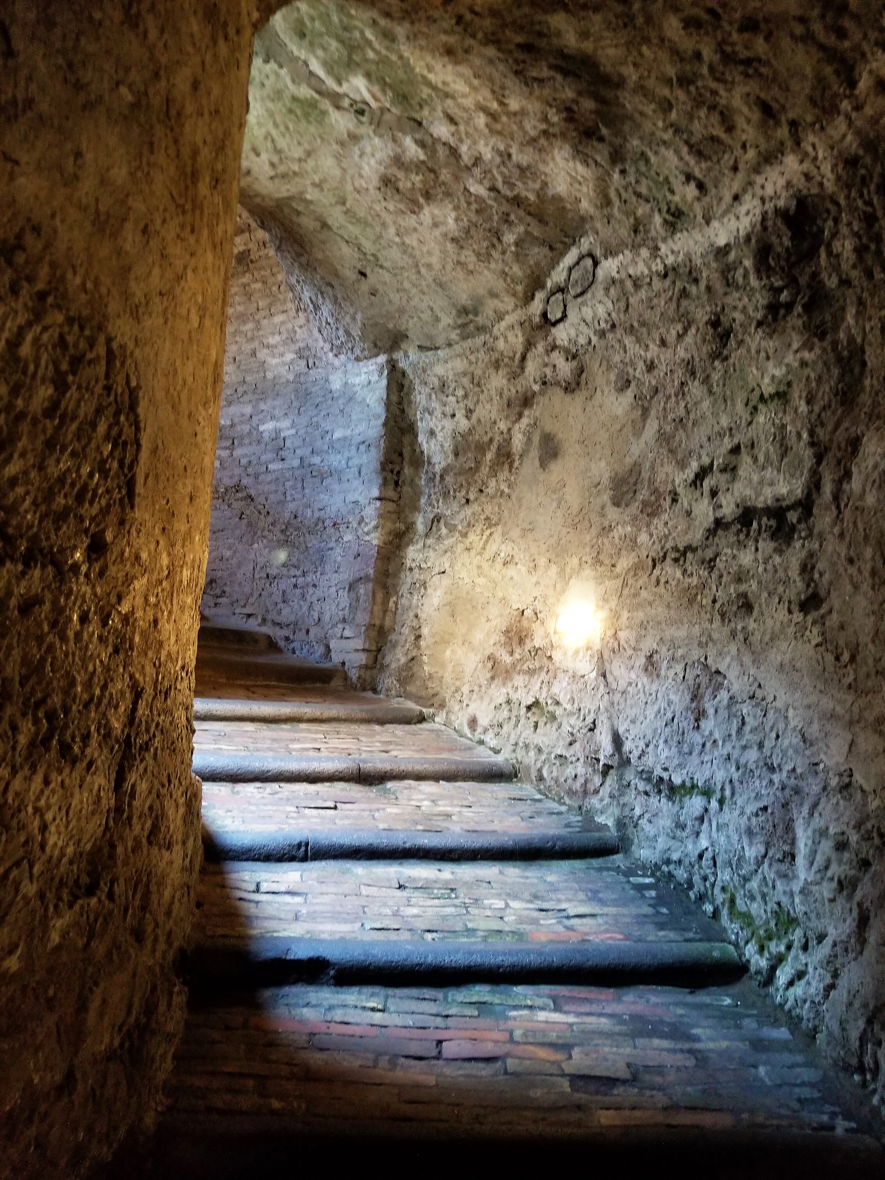Orvieto has been continuously settled for 2700 years and pre-dates the Roman era.  The early inhabitants, the Etruscans dug caves and wells for water in the soft lava material (tufa) that makes up the hill that Orvieto perches upon.  The caves and water source enabled the Etruscans to literally hole up when invaders attacked.  The practice of digging caves continued for about 2500 years and now there is thought to be about 1200 caves.  Once you see the size of Orvieto this is a mind-boggling concept.  The hill must look like Swiss cheese.  The government is mitigating any ground weakness by engineering underground columns and prohibiting new caves or alterations to existing caves.