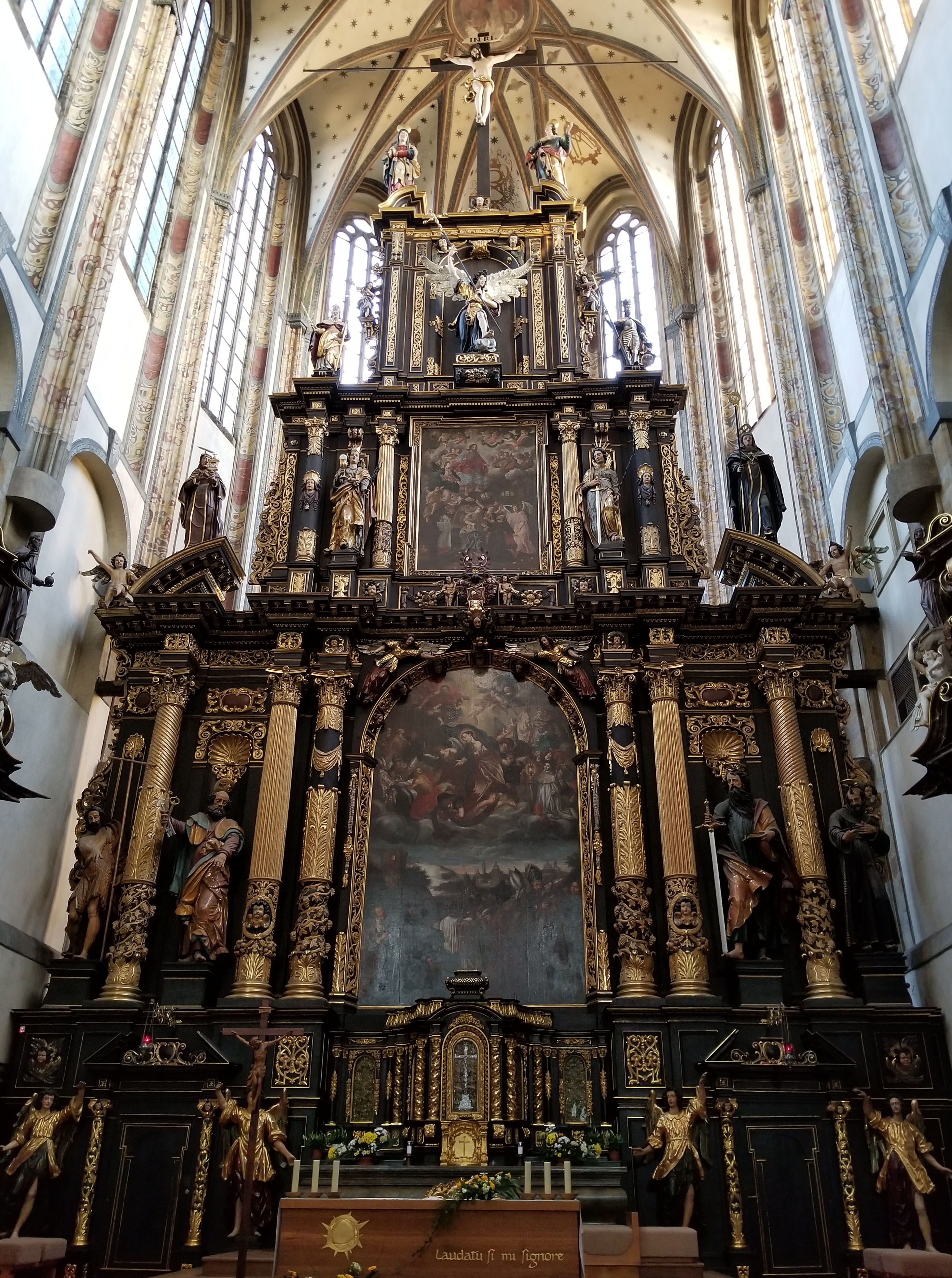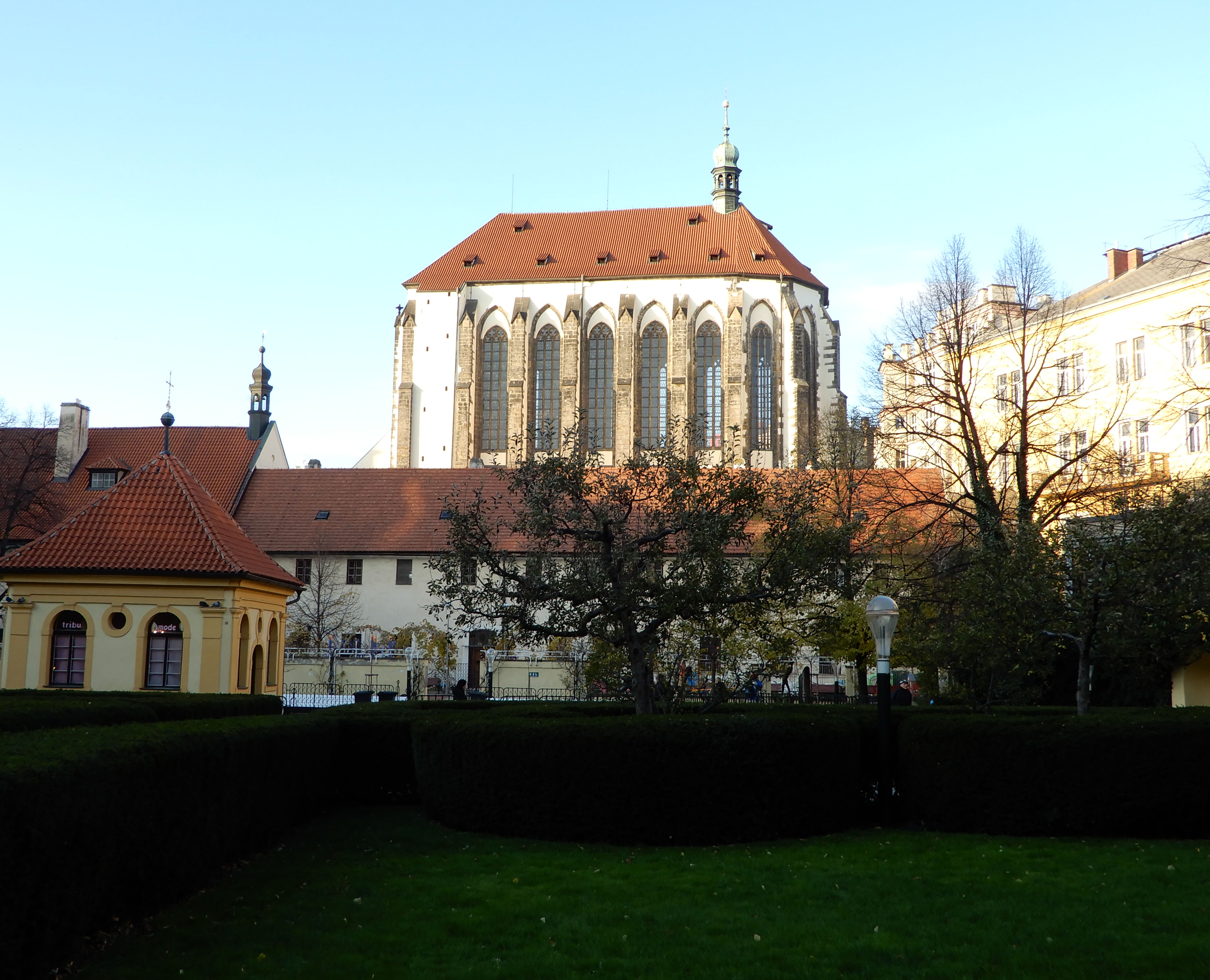 Further on our scavenger hunt we located the walled secret Franciscan Gardens, a 14th century lush public garden. From here we could see the Church of Our Lady of the Snows rising up above the skyline. To make our way to the Church, we wound through a couple of Cubist public art installations that were also part of our hunt. The interior of the Church was breathtaking. The Church stood open with almost no one around welcoming anyone seeking shelter. Surprisingly we were the only apparent tourists and a couple of only a few people present. It felt almost like we were someplace that we weren’t suppose to be and we had snuck in.