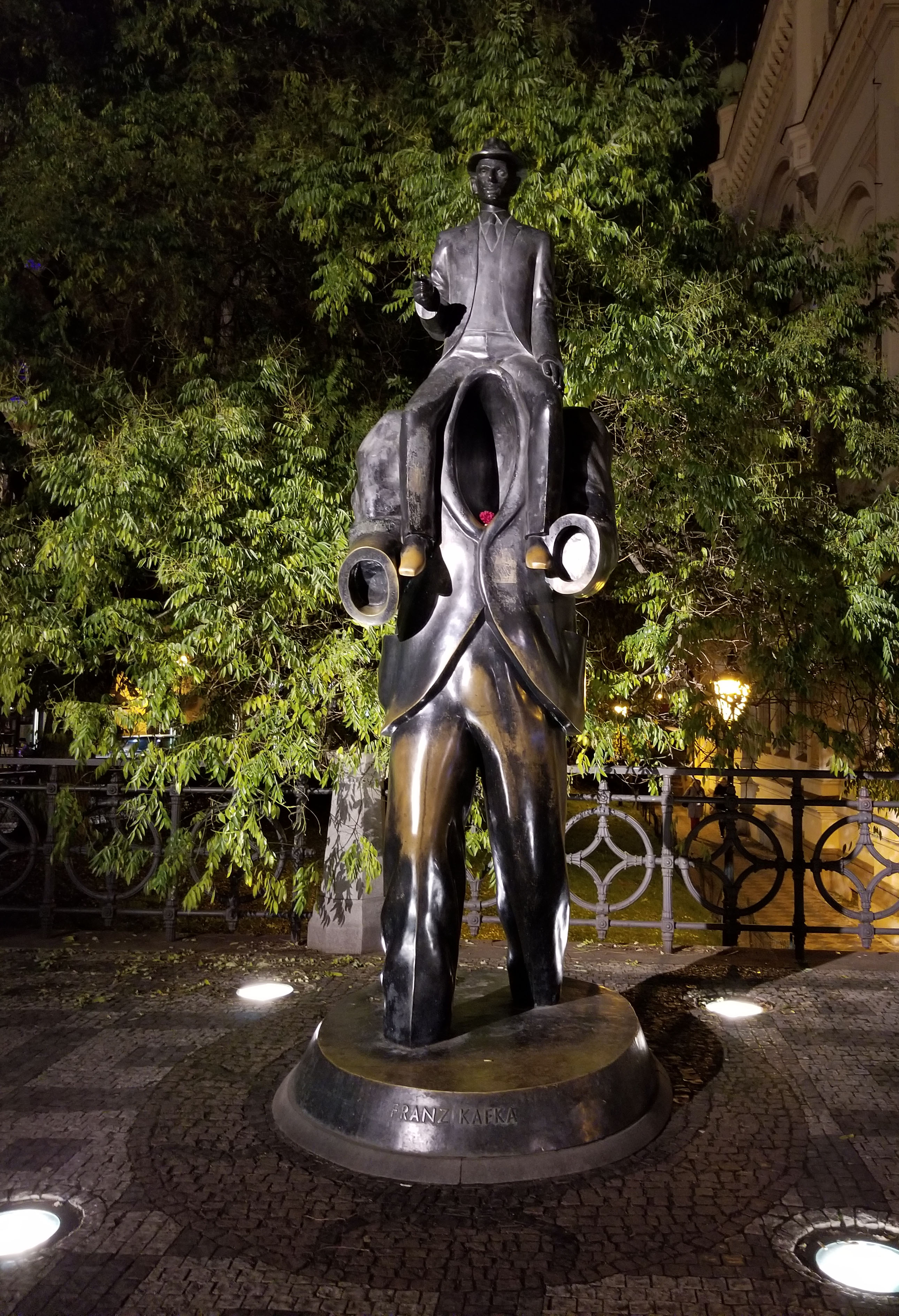 Our first stop was the Art Nouveau Lucerna Palace, a shopping mall just off of Wenceslas Square. In the rotunda of the mall is a statue of Good King Wenceslas riding an upside-down horse as a mocking tribute to past and modern leadership of Prague. The ancient king rides triumphantly astride an upside-down, apparently dead horse to signify the turbulent and Topsy-turvy state on Prague politics.
