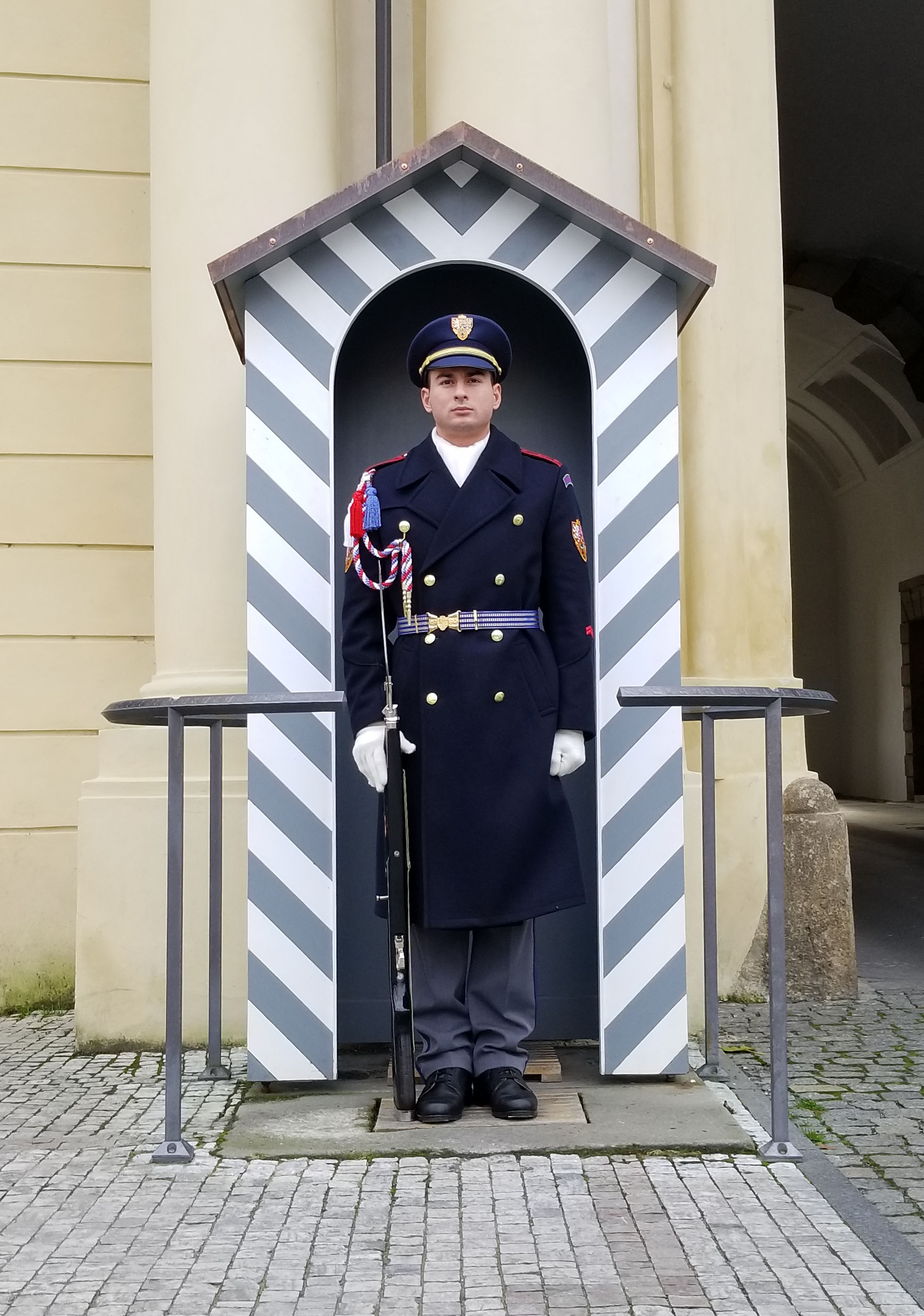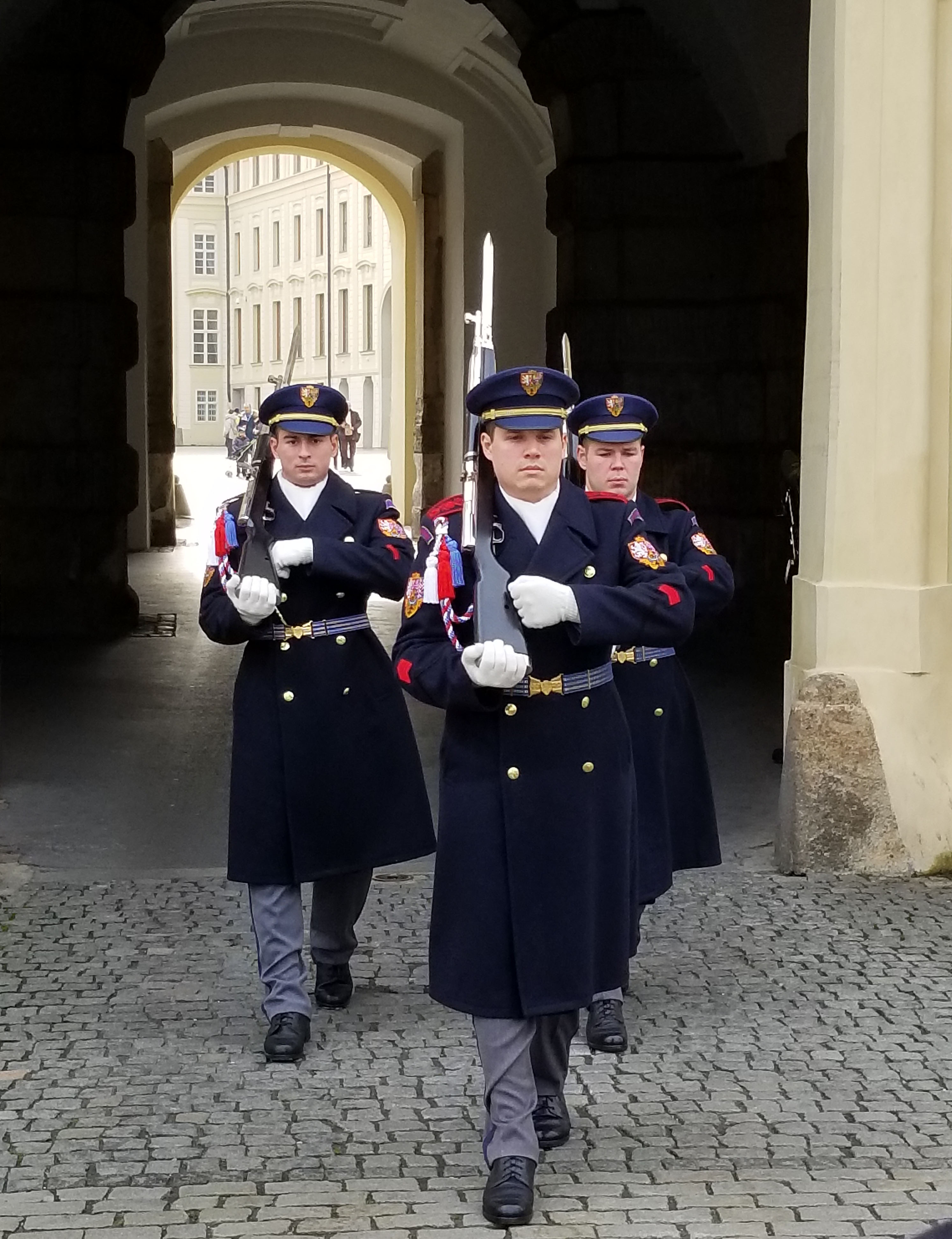 The castle is still the seat of government of Prague and the President. This combined with the historical beauty and significance of the site dictates a high level of police and military presence in and around the castle. We arrived by Metro to the Pražský Hrad light rail station. This gave us the opportunity to enter across the bridge overlooking the Stag moat. This entrance is also where the changing of the guard occurs.