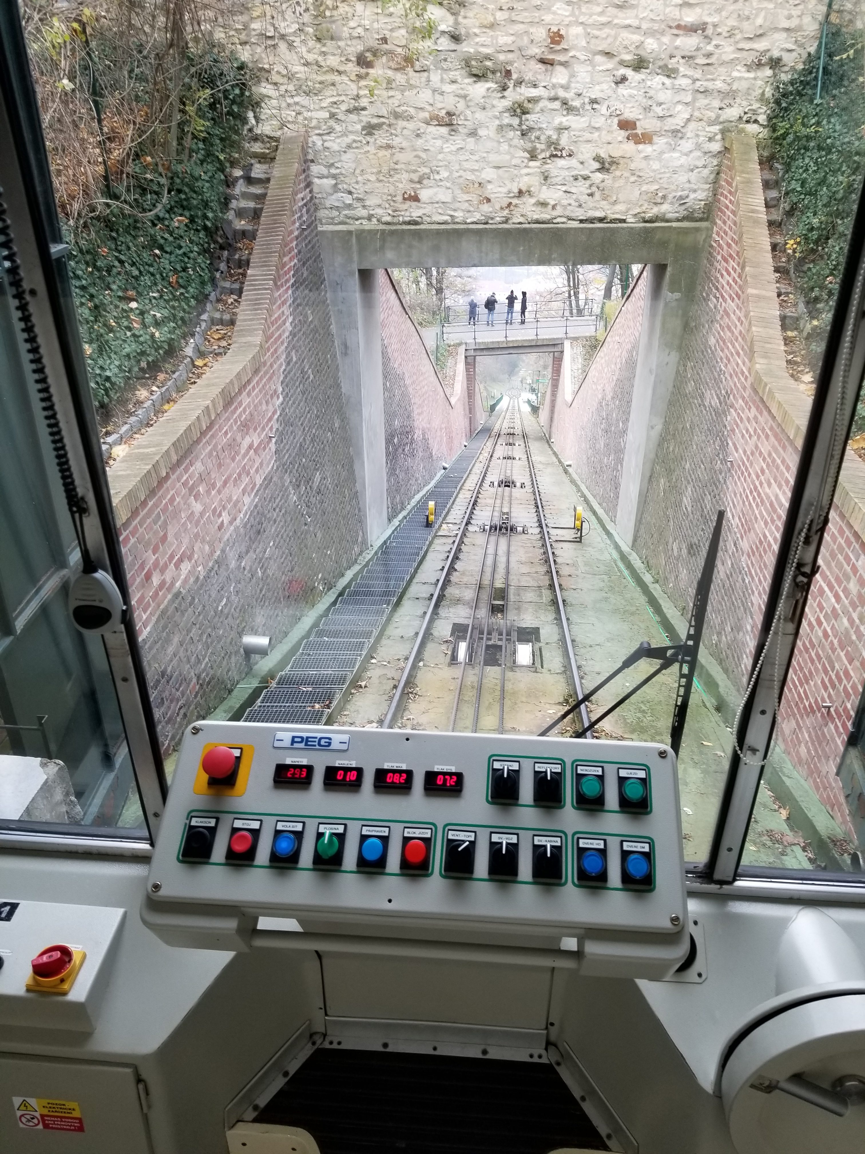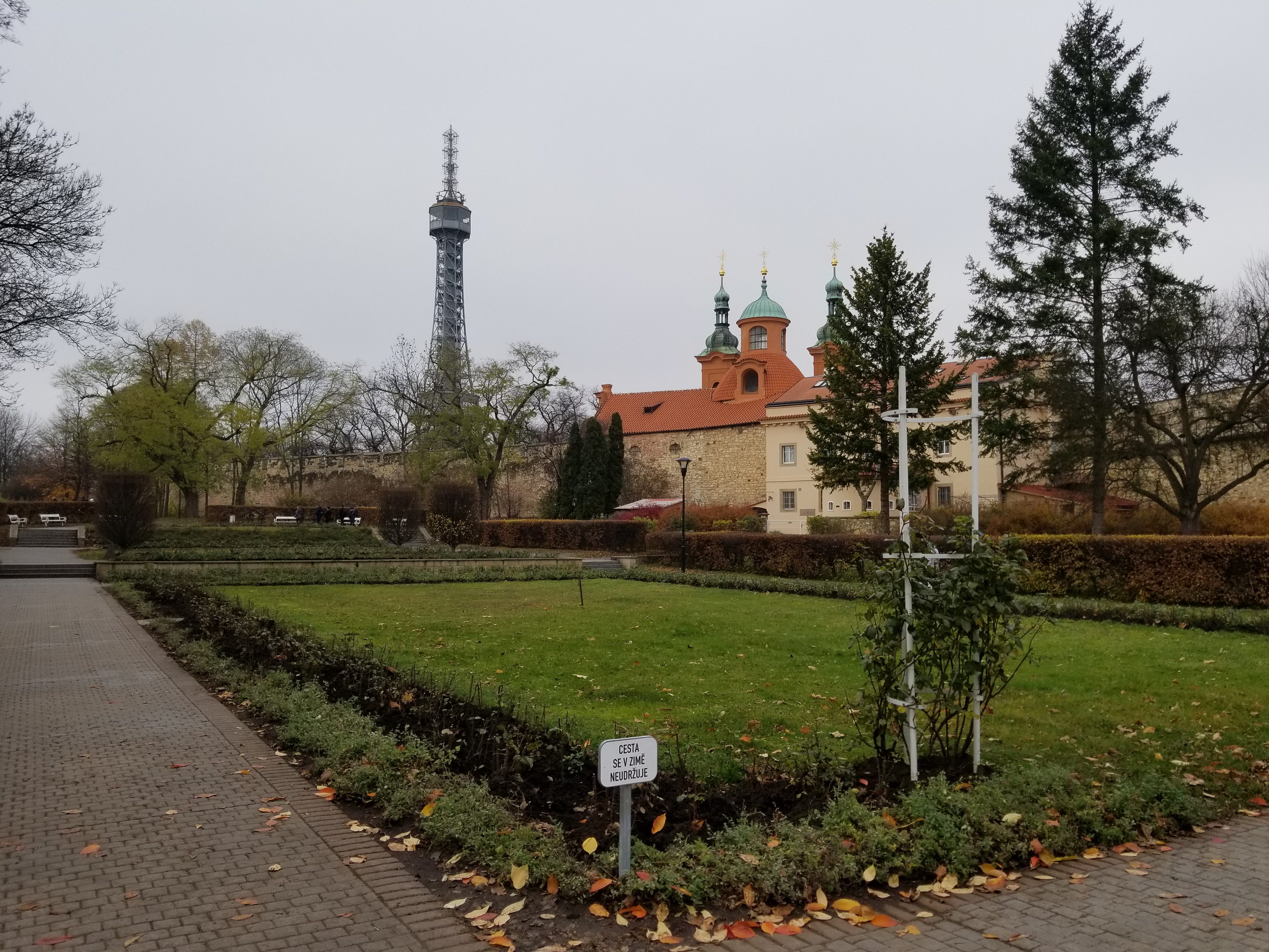 Petřín Hill is on top of a rocky hill on the same side of the Vltava River as Prague Castle. The hill is covered with park lands and is a favorite of Prague residents. It also has a number of other attractions including a Rose garden, the Petřín Observation Tower, a mirror maze, and observatory, and the Cathedral of Saint Lawrence and St Michael’s Church. We took metro to the Ujezd Light Rail stop so we could ride the funicular to the top of the hill. The funicular started operating in 1891 connecting Prague’s Malá Strana district to the hill’s summit.