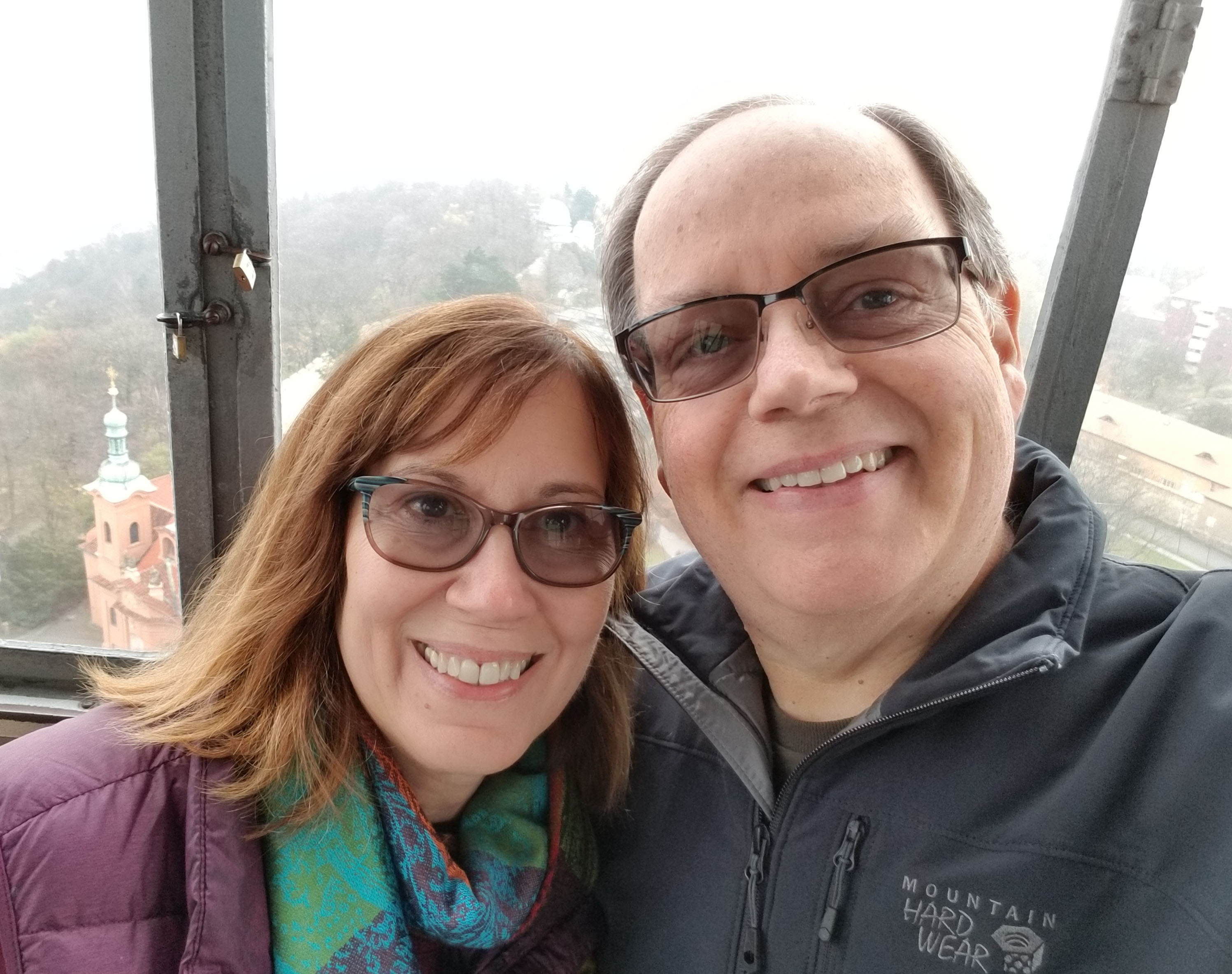 The Petřín Observation Tower (Petřínská rozhledna) is a steel tower structure resembling the Eiffel Tower in Paris. The tower was originally a transmission and observation tower and rises 208 feet above the hill, or a total of 634 feet above the Vltava River. While the tower has 13 stories (yes, 13 stories) of stairs totaling 299 steps to reach the upper observations platform, there is also an elevator that is worth the 1 1/2 to 3 dollar added cost. We chose the elevator. Although Barbara did walk down the steps when we left.