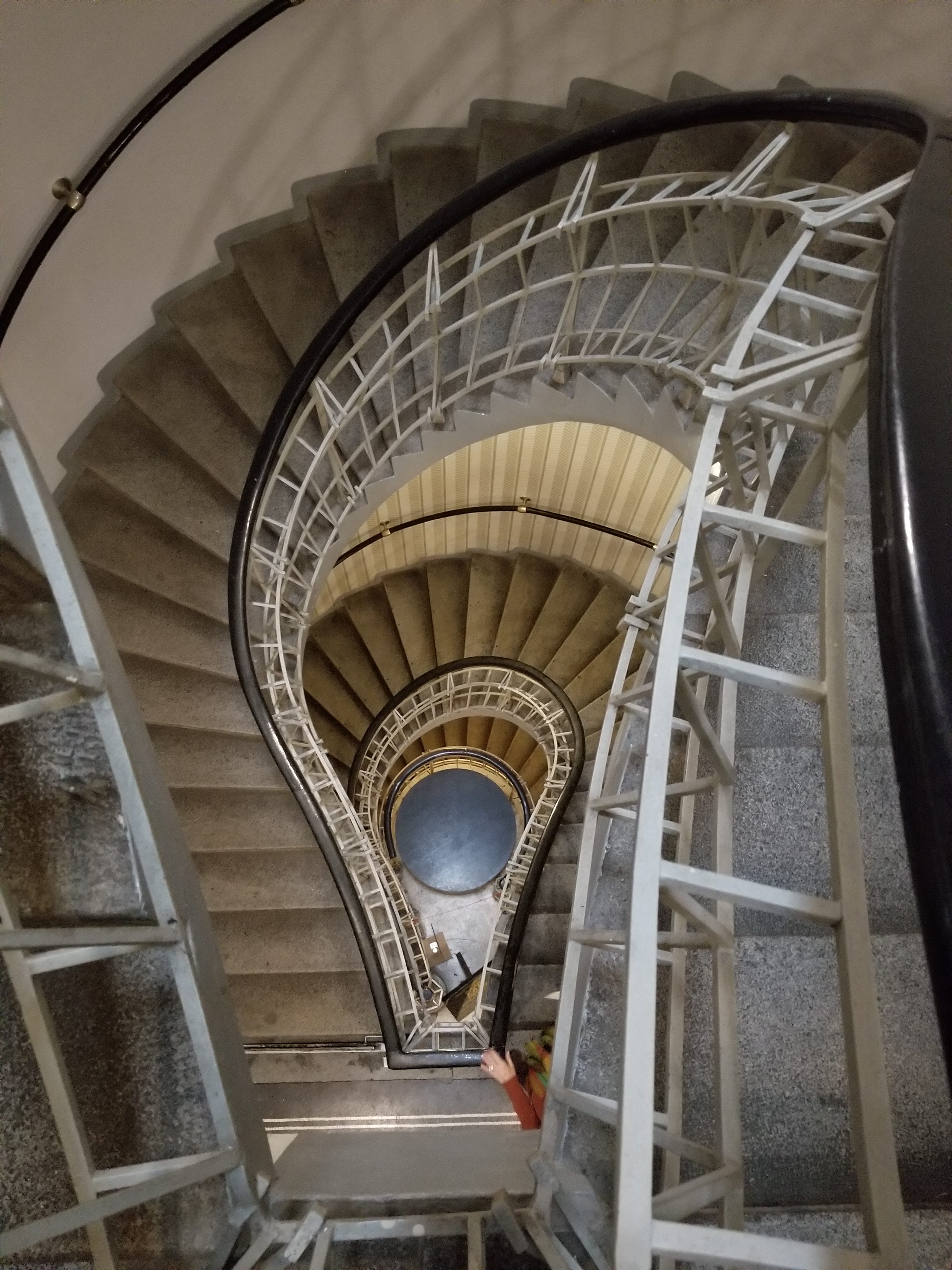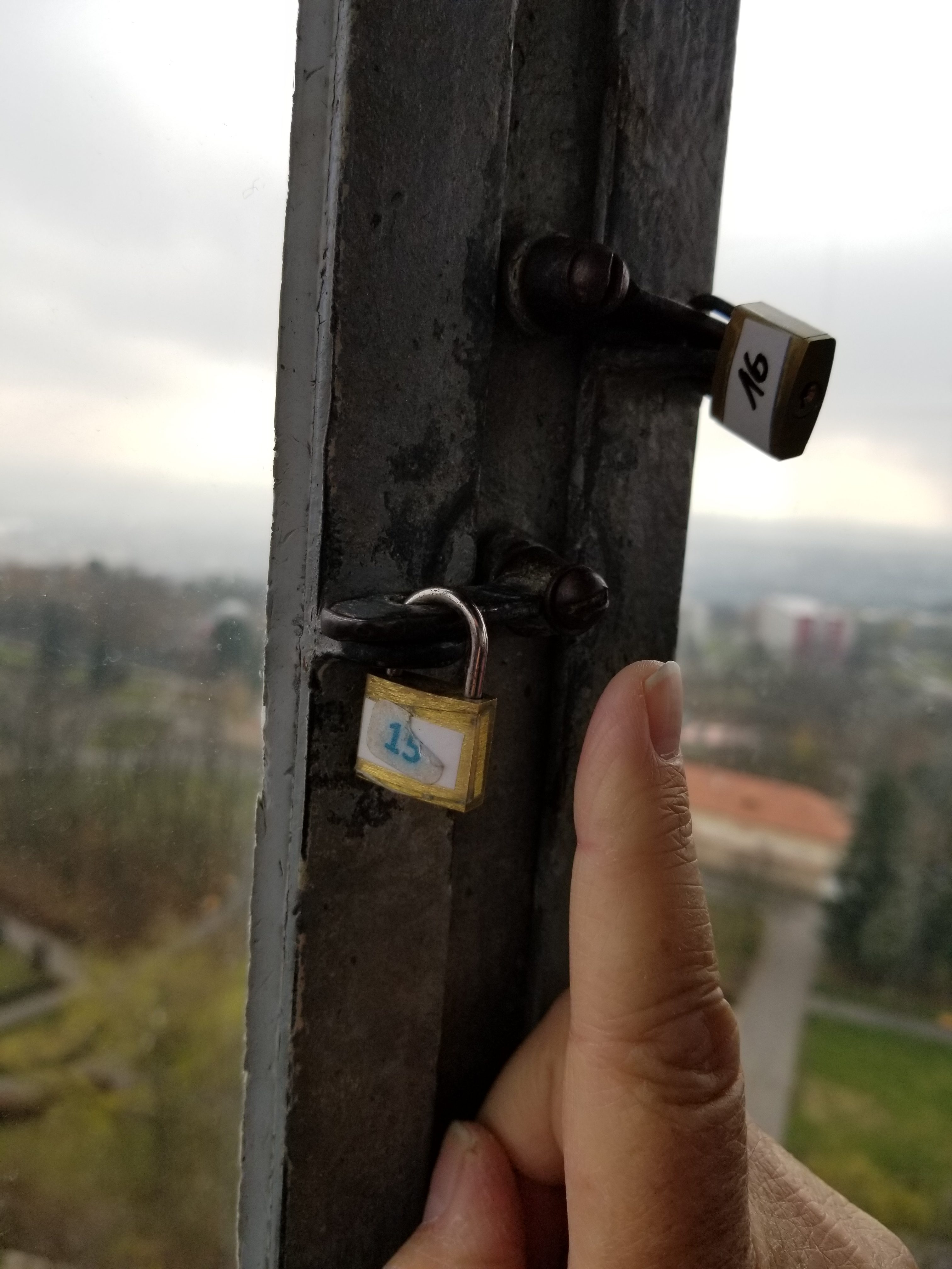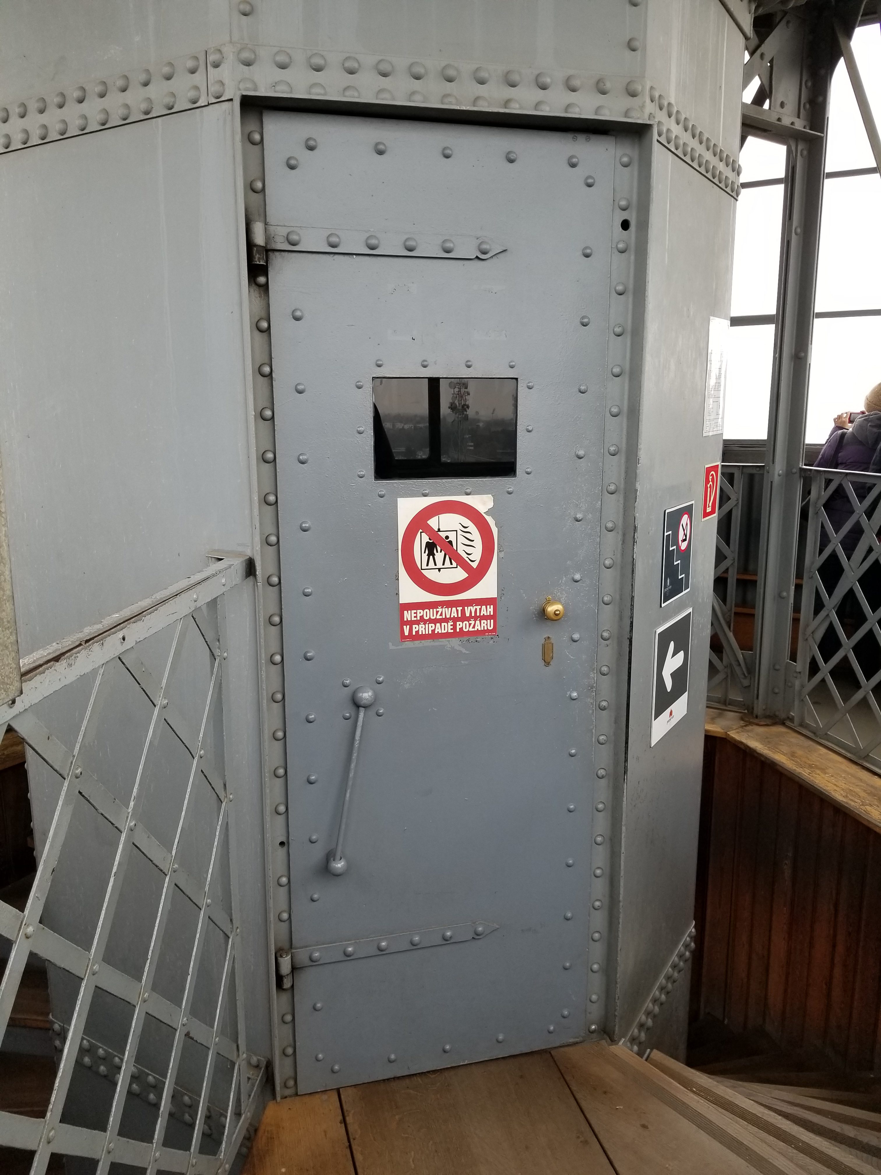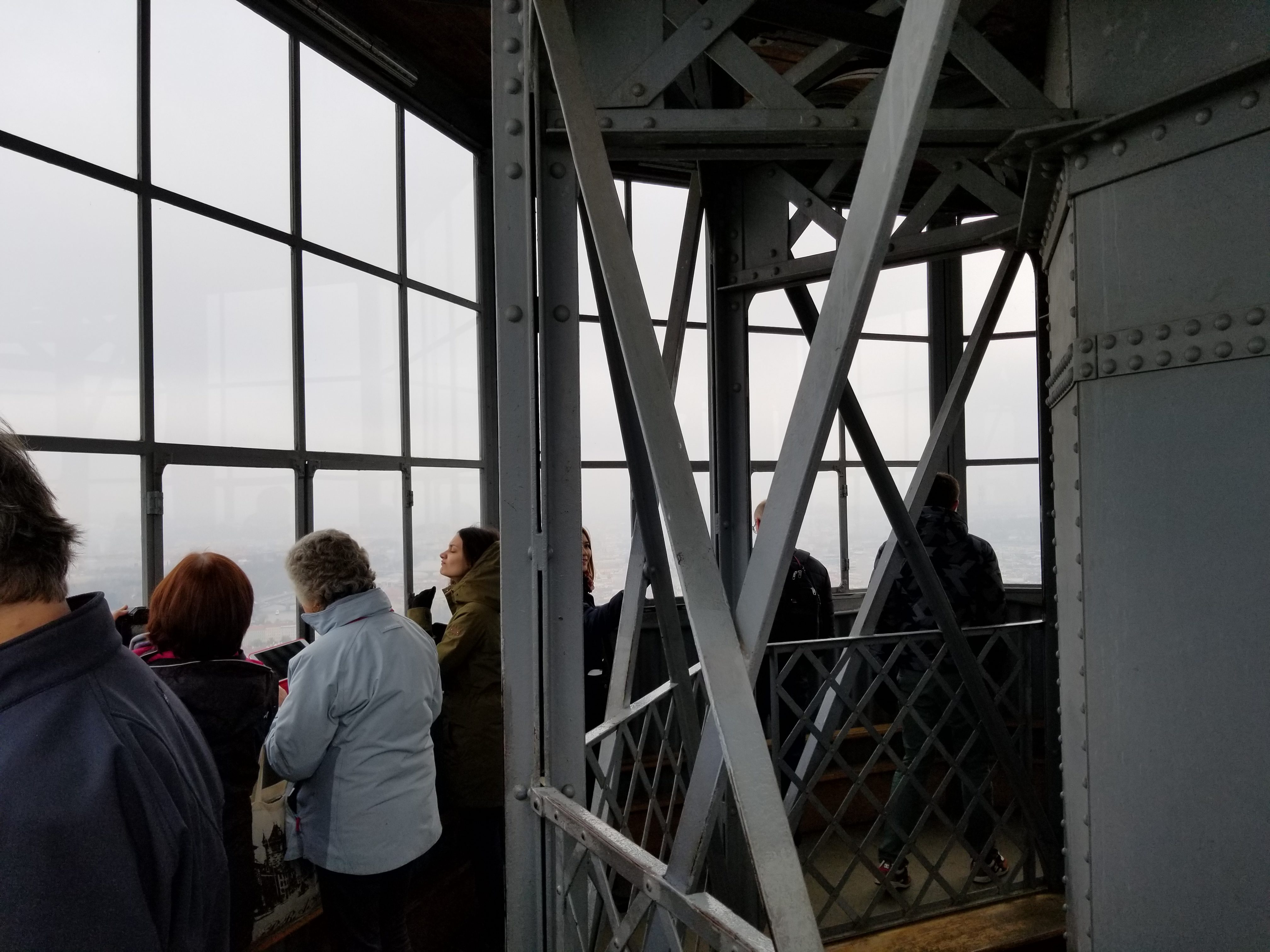 While the elevator entrance (below left) looks like some kind of prison door, the elevator shaft runs down through the center of the tower. As a warning to those concerned with tight spaces, the elevator car is about 3 feet by 4 feet. There were five adults plus the elevator operator in the car for our ride. It was very tight and cozy. Selfies would be very impressive on a clear day. All of the 360 degree windows surrounding the observation deck appear to be able to be opened, except for the heavy duty security hardware installed (LOL). It is clearly an honor system.