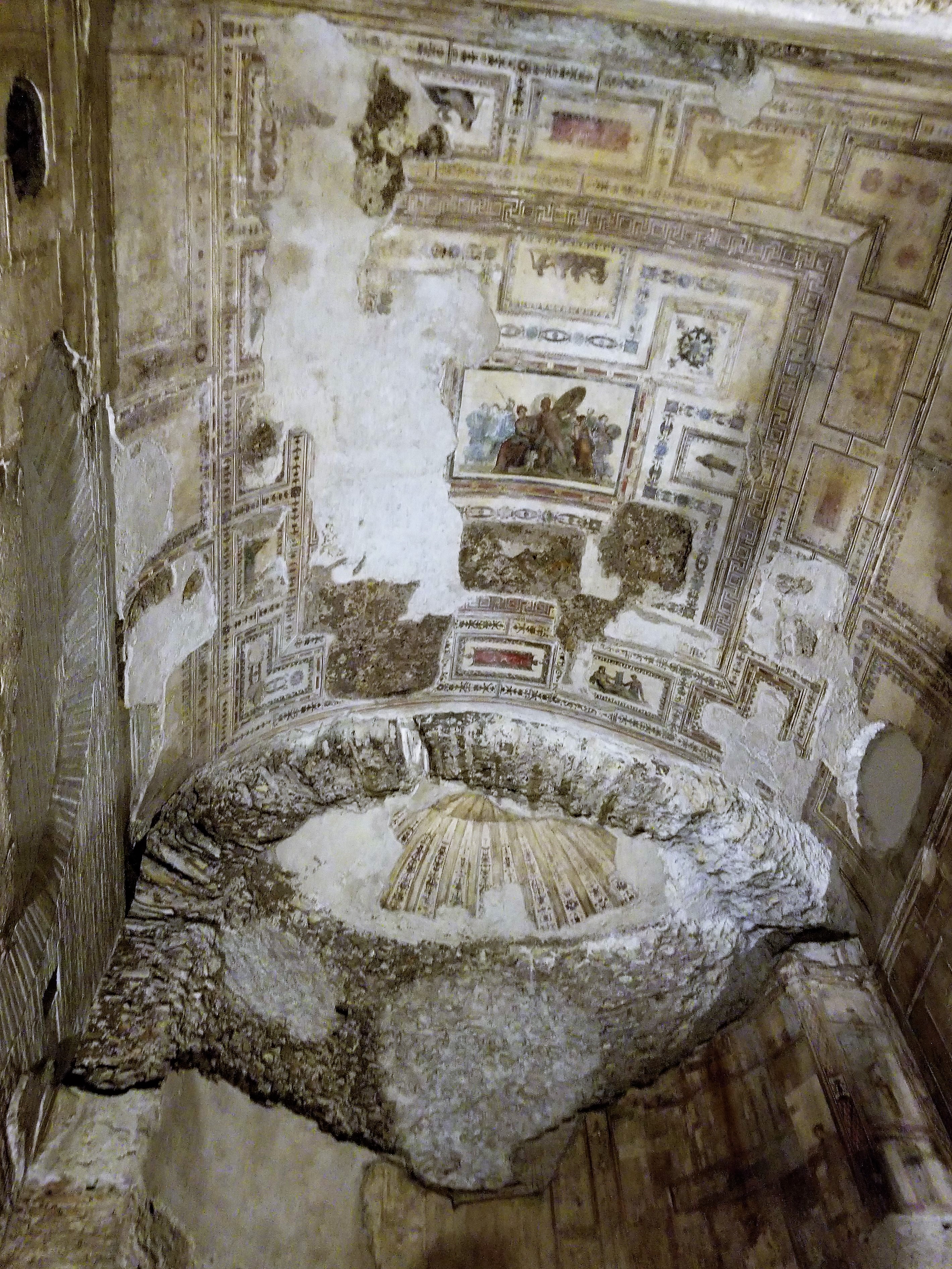 Following Nero’s death his successors made haste to erase every trace of his embarrassing excesses. The villa was stripped of its precious materials. The interiors filled with dirt and rubble and public baths were built over it. This burying helped to preserve much of the frescos that were left. The deterioration of the frescos occurred from exposure to air and water after the buried ruins were discovered 1500 years later.