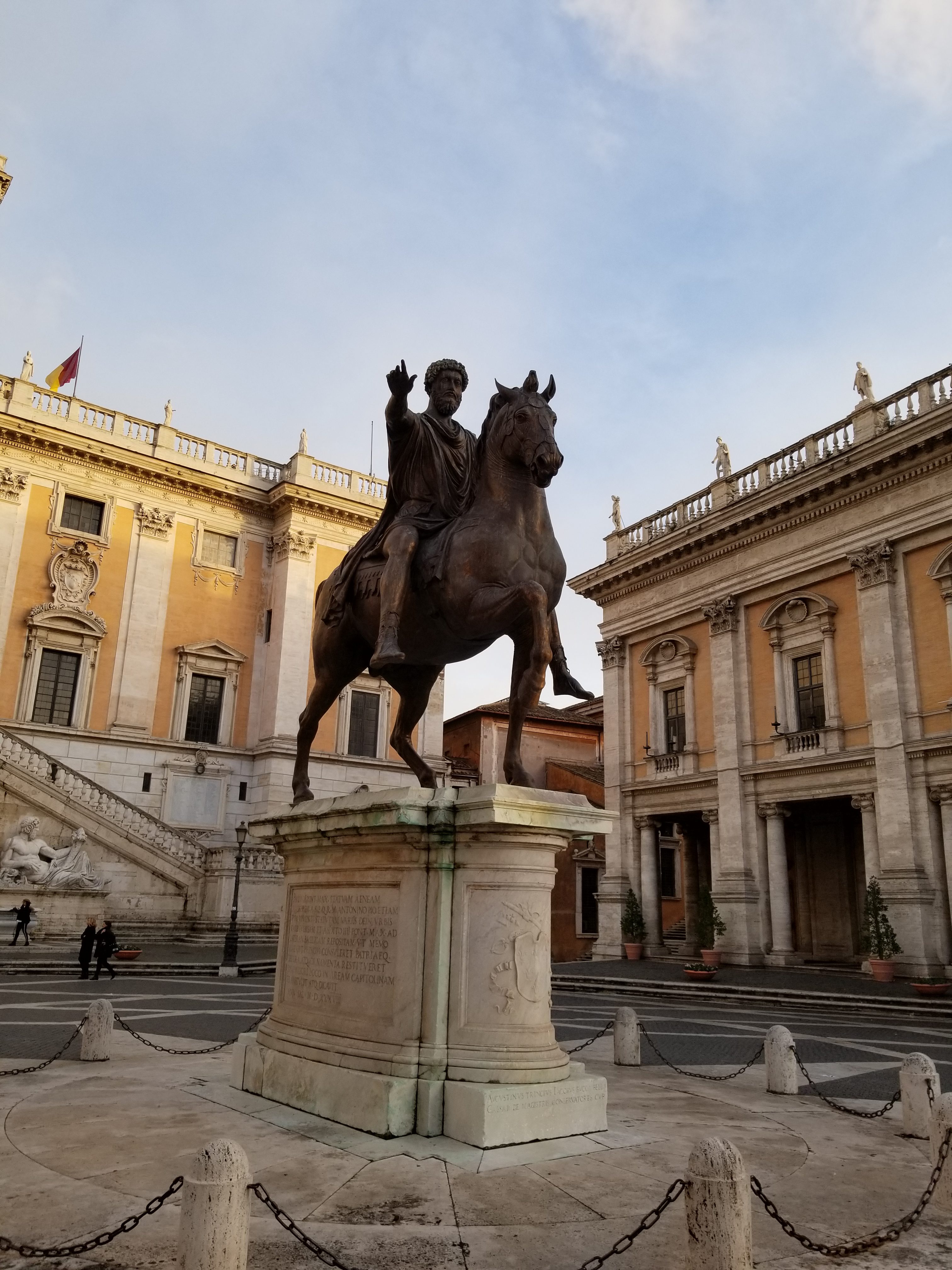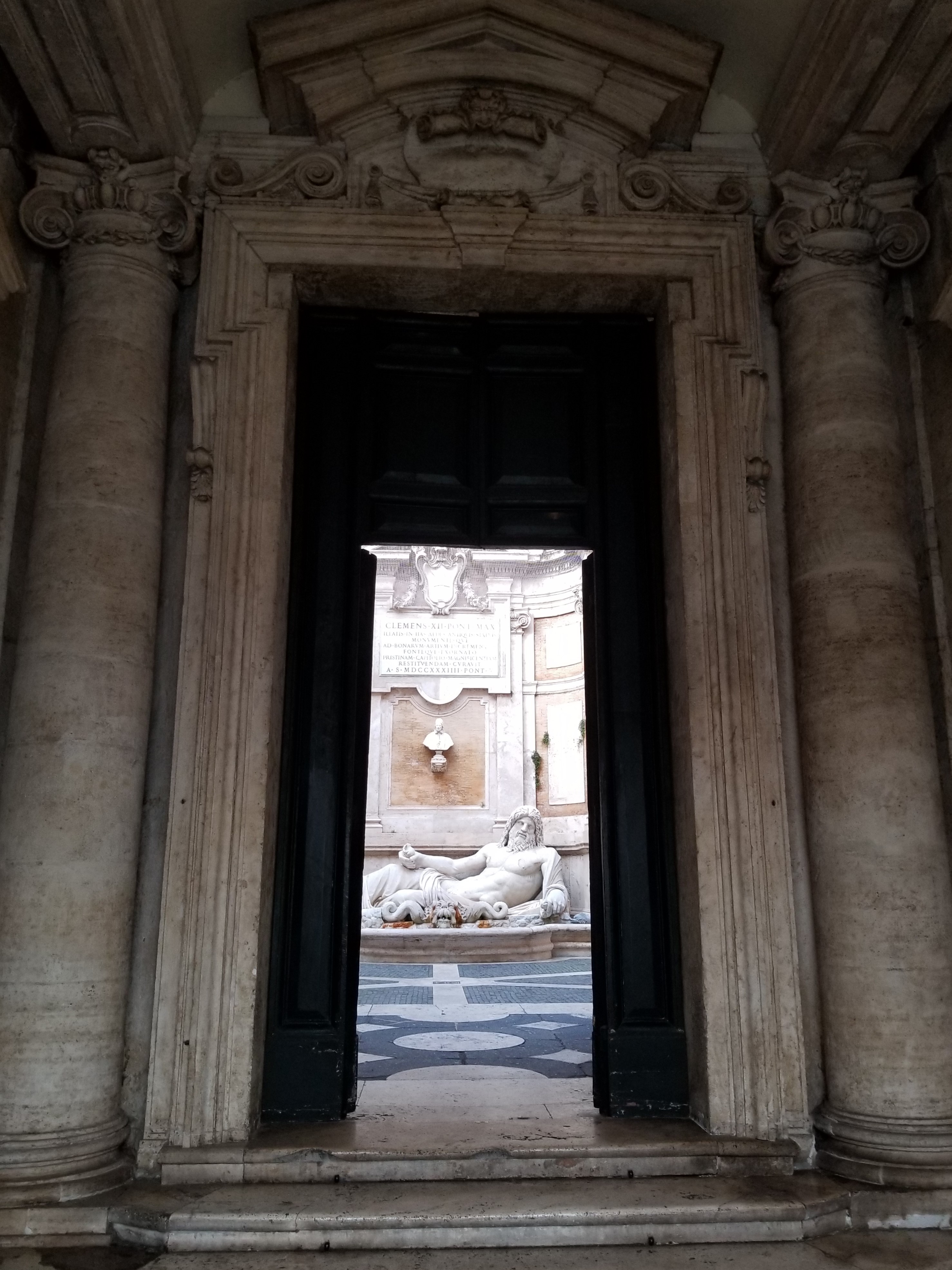 We take Bus 51 to visit the Michelangelo-designed Capitoline Museums located on the tallest of Rome’s seven hills – the Capitoline. Disembarking at the Via Dei Fori Imperial stop was a magical sight. Literally, we see one amazing ruin, enchanting monument, or exquisite building after another! A short walk up a curved lane provides us with a dramatic bird’s-eye view of ruins. We join a seagull in admiring the Forums and the Arch of Septimius Severus.
