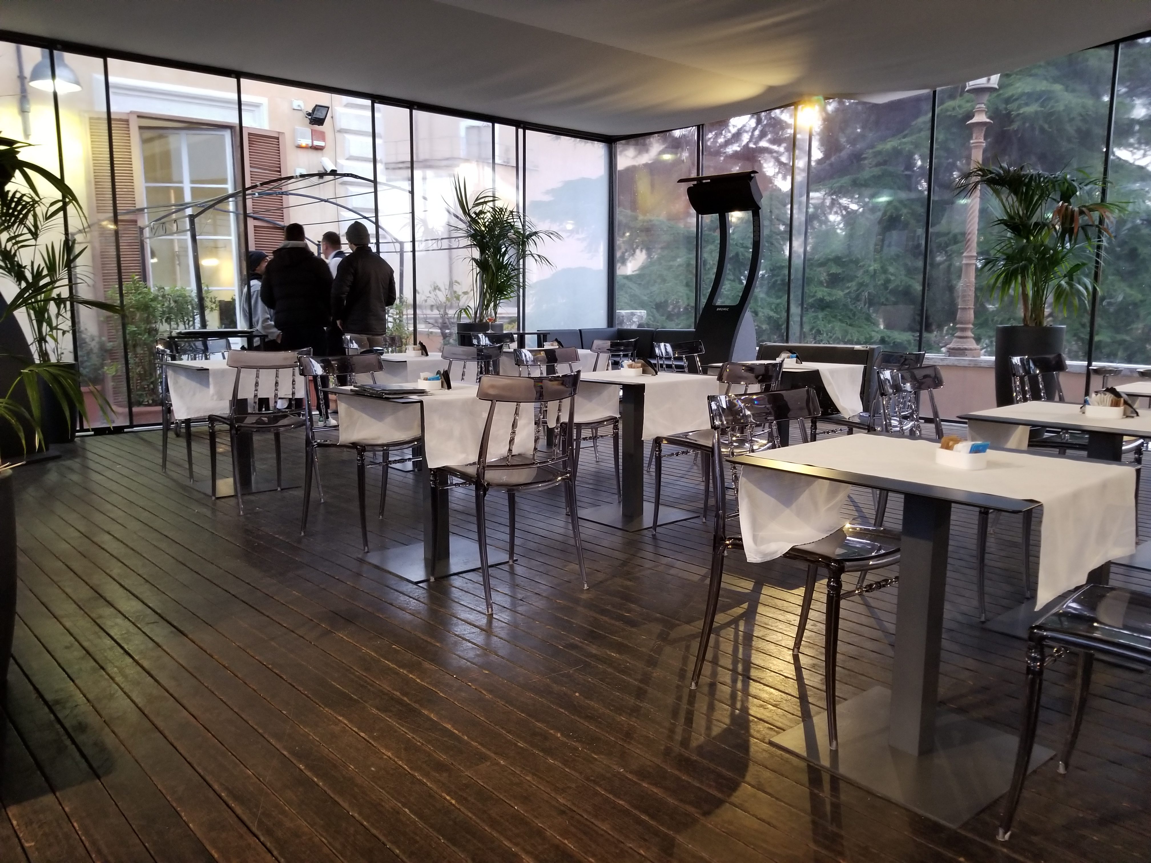 The Caffarelli is open to the public without a museum entrance ticket. The café has a lovely little patio with olive trees and a view of bella Roma looking out over the Jewish Quarter in the direction of the Tiber. The café is enclosed in a tent with see-thru panels and plenty of heaters. It’s a great place to sit outdoors but be comfy and warm and be romanced by Rome some more. We enjoy a warming and tasty snack of espresso and mini pizzas topped with paper-thin slices of potato and rosemary…so good…perfect carb pick-me-up and reasonably priced, too.