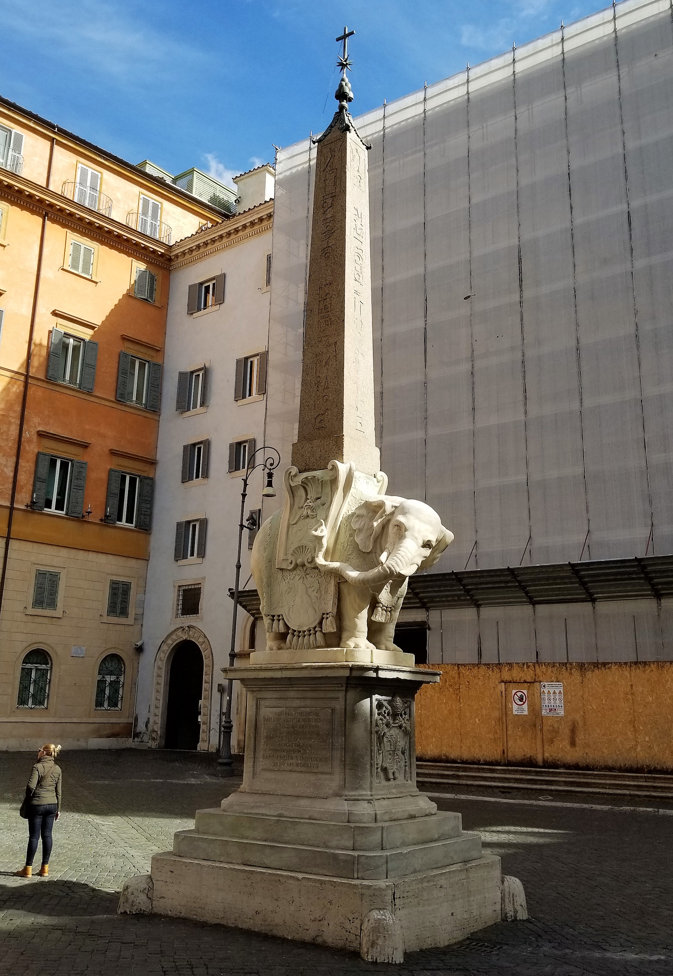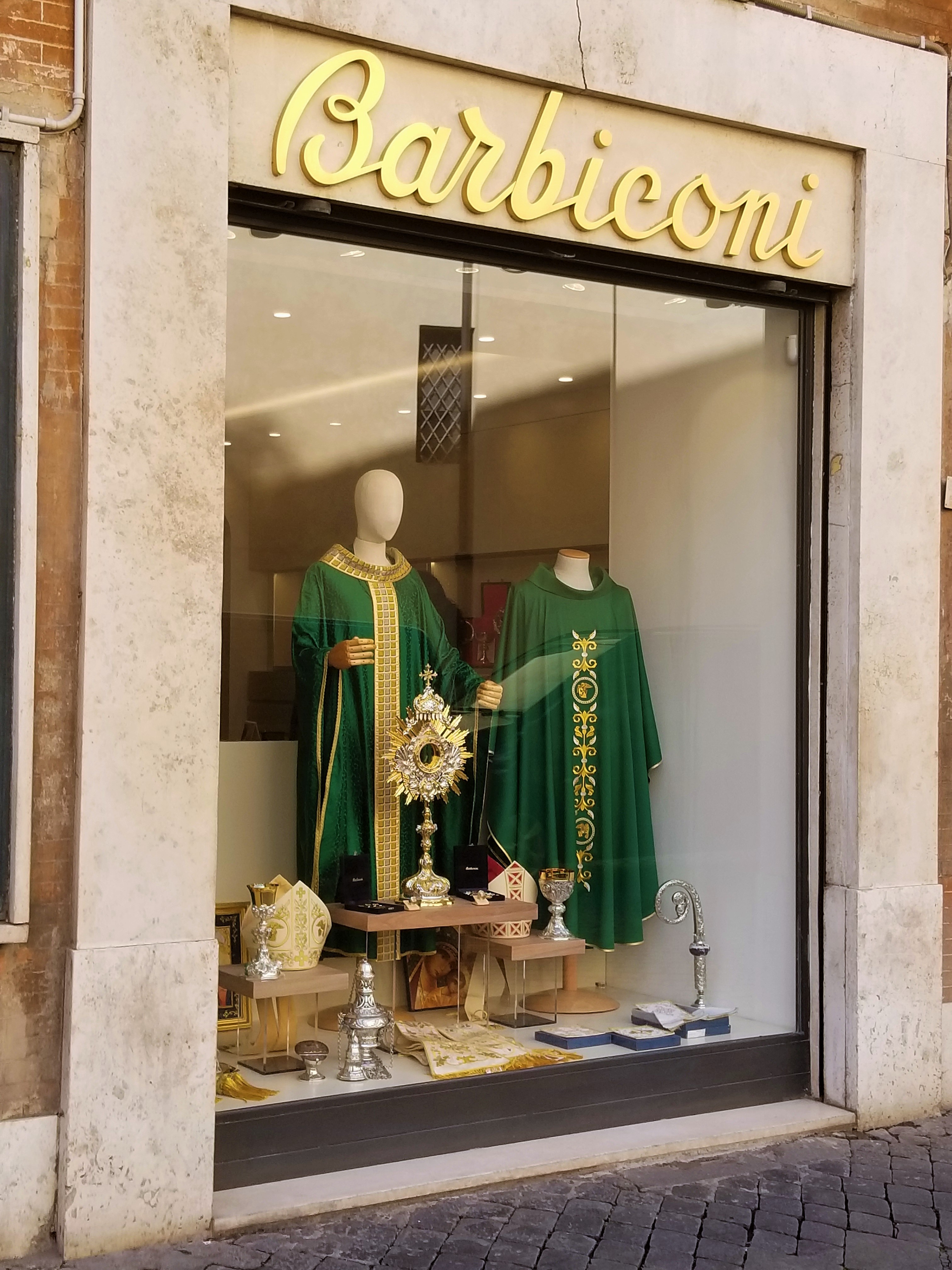 Bus numbers 85 or 87 run from the Colosseo bus stop to the Corso stop which is just a few blocks from the Pantheon. Our first point of interest along our walk is Piazza Minerva which is graced with an unusual elephant obelisk sculpted by Bernini. As we walked toward the Pantheon we came across this store window with colorful and exquisitely made garments for catholic clergy and stopped to take this picture.